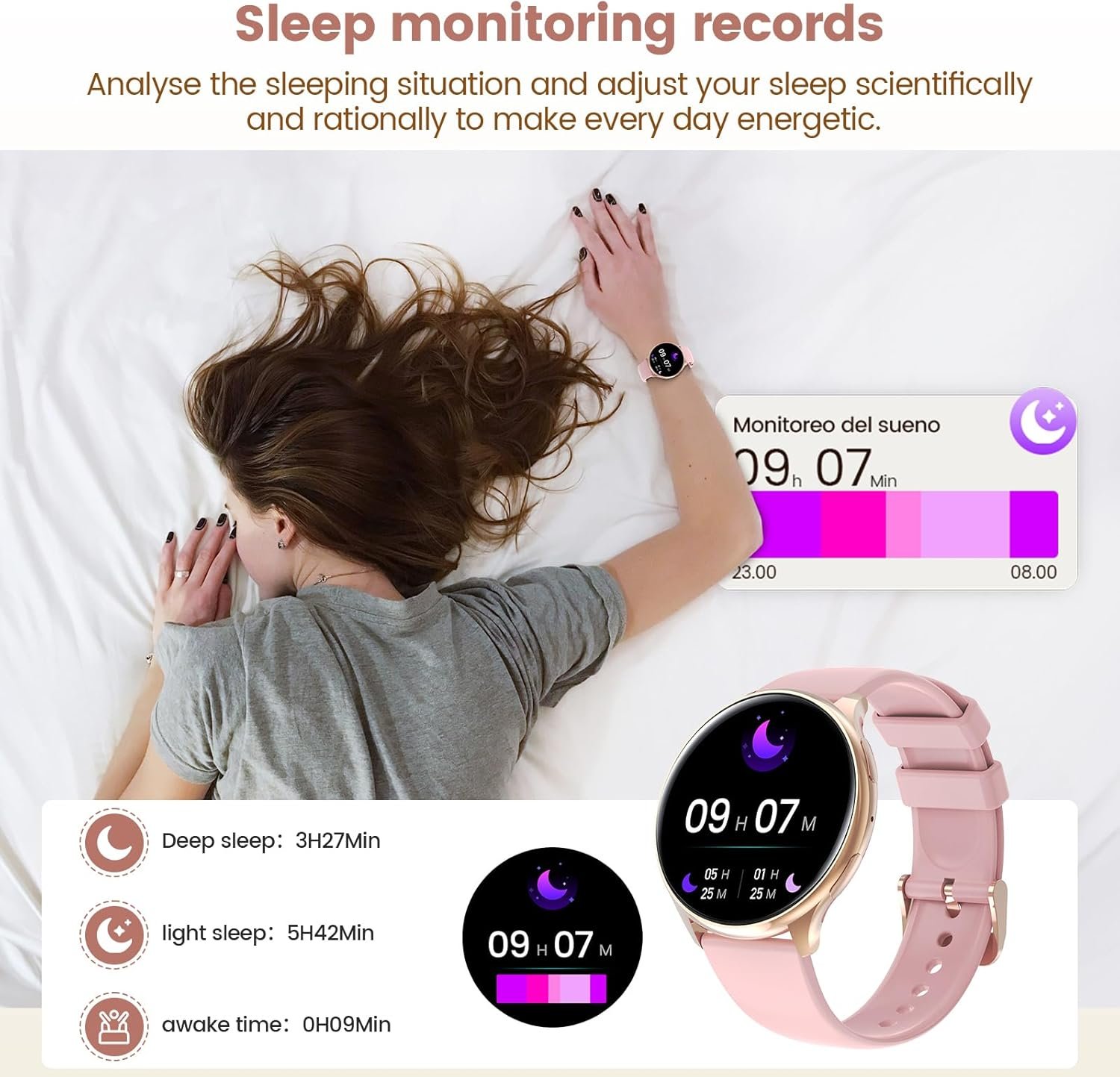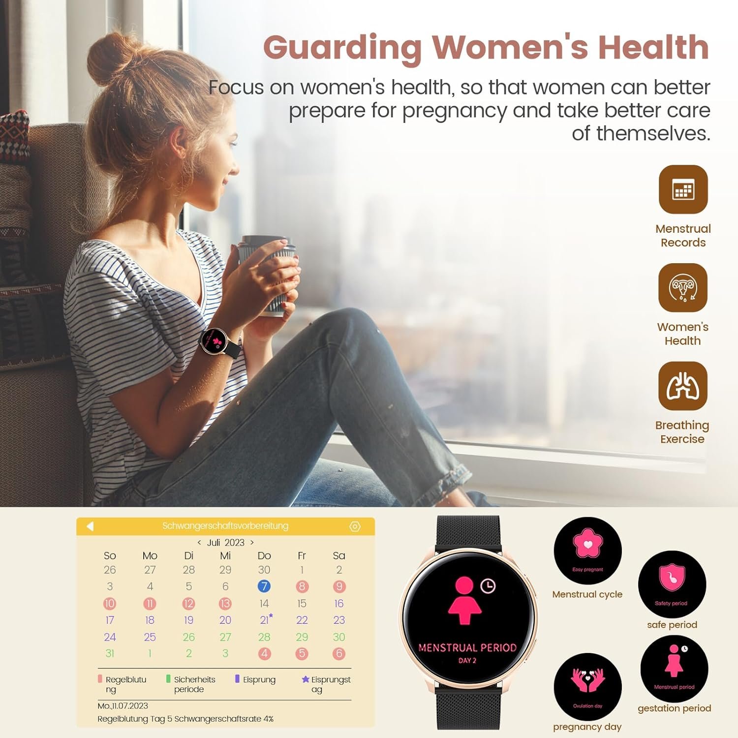 Attention to Women’s Health Protection : The new smart watch for women can monitor real-time heart rate, measure blood pressure and blood oxygen levels, automatically record sleep and many other functions. There is also a menstrual cycle tracking function that helps women predict and record their period and ovulation for better care and more accurate preparation for a successful pregnancy and delivery