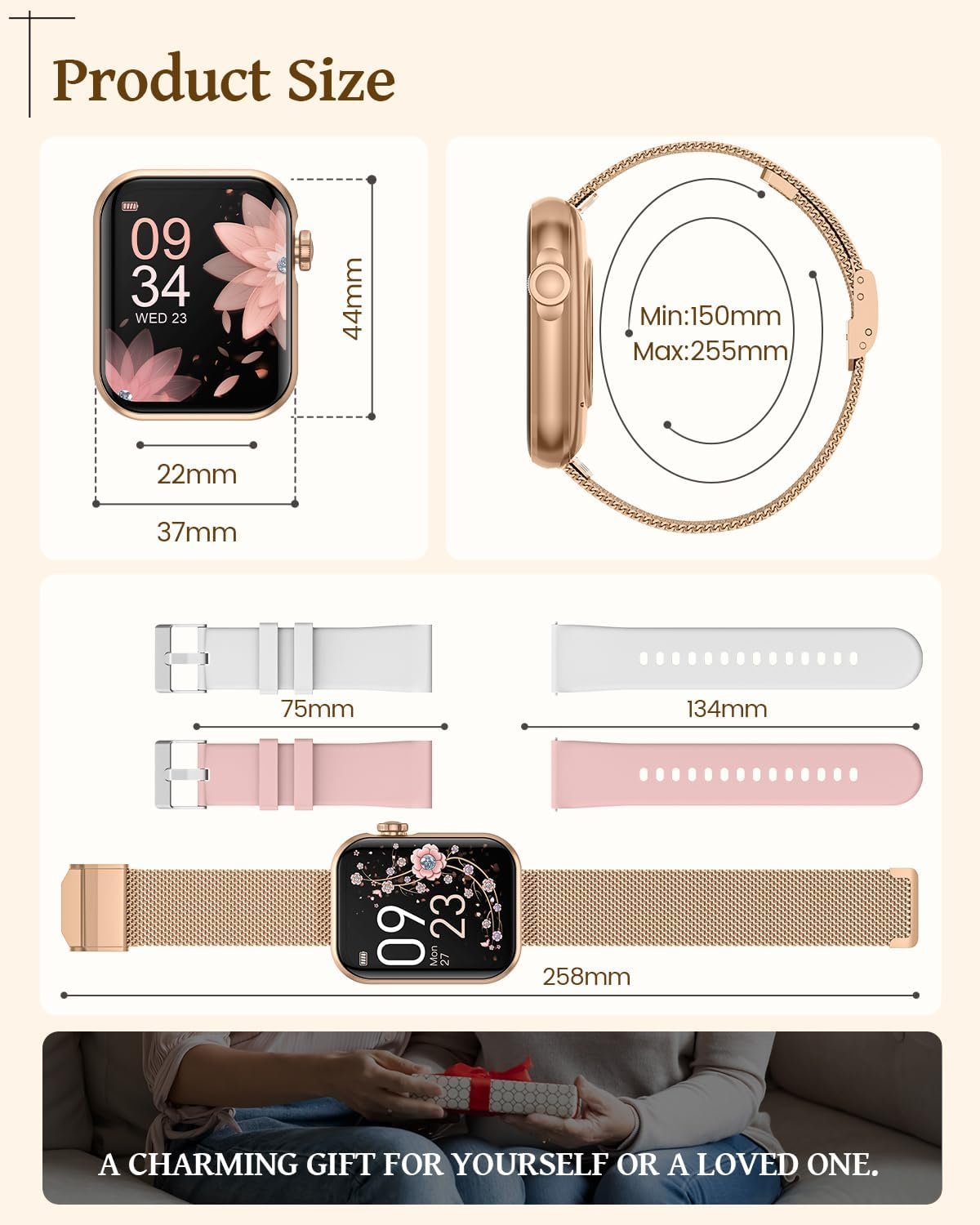 [3 Straps Included] DEKEELIFE smart watches for women comes with 3 bands – one gold stainless steel strap, one pink silicone strap and one white silicone strap. Wear different colors and materials of the strap to switch between different styles. The smartwatch fits any band with a width of 22mm.