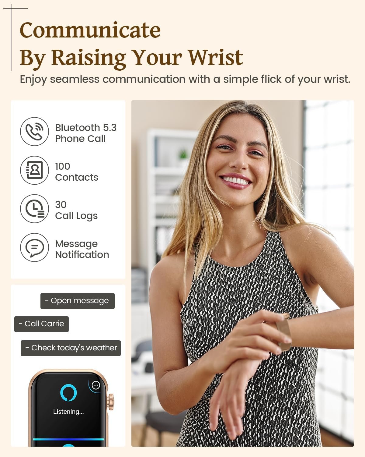 [Smart Watch for Android Phones/iPhones] The smartwatch is compatible with most iPhones and Android phones (Android 6.0 and above/IOS9.0 and above). The smart watch for women supports synchronization of 100 contacts, weather forecast, play music, control camera and more. Please make sure your phone is paired with the watch before use.