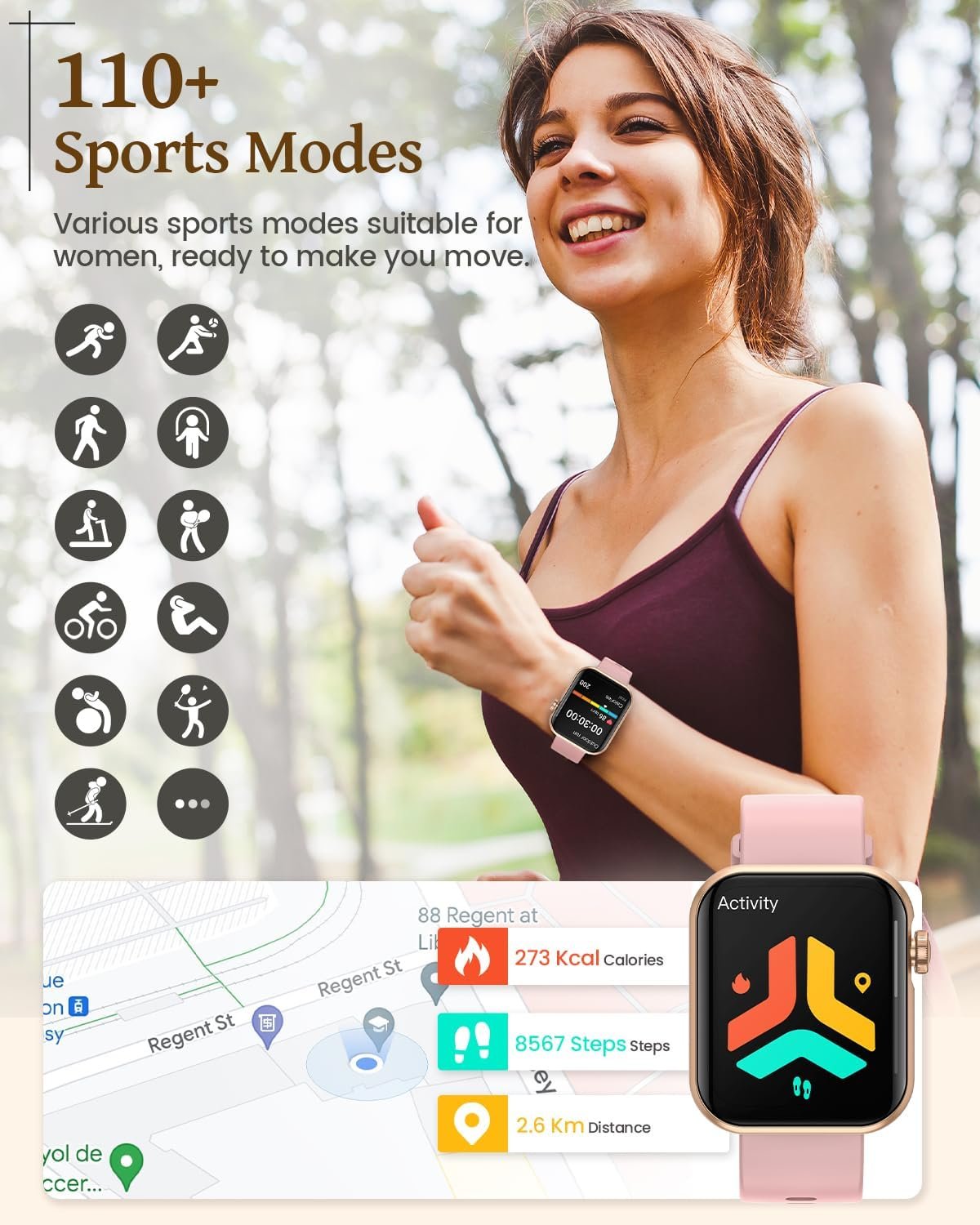 [110+ Sport Modes Fitness Tracker] The Fitness watches for women/men supports 110+ sports modes. Accurately record heart rate, steps, distance, calories burned. The activity tracker is able to realize GPS location through your phone and clearly upload your movement path.