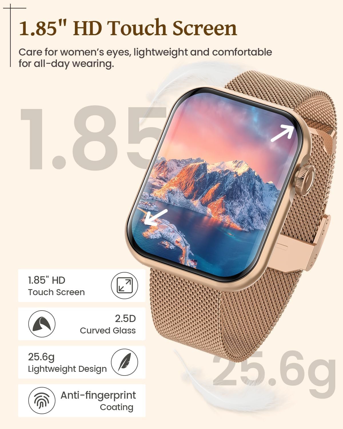 [24/7 Health Monitoring] The heart rate monitor watch supports real-time monitoring. The smart watch with blood pressure monitor, sleep (deep sleep/light sleep) monitor, and women’s health function, etc. Supports synchronization of data to APP for easy viewing.