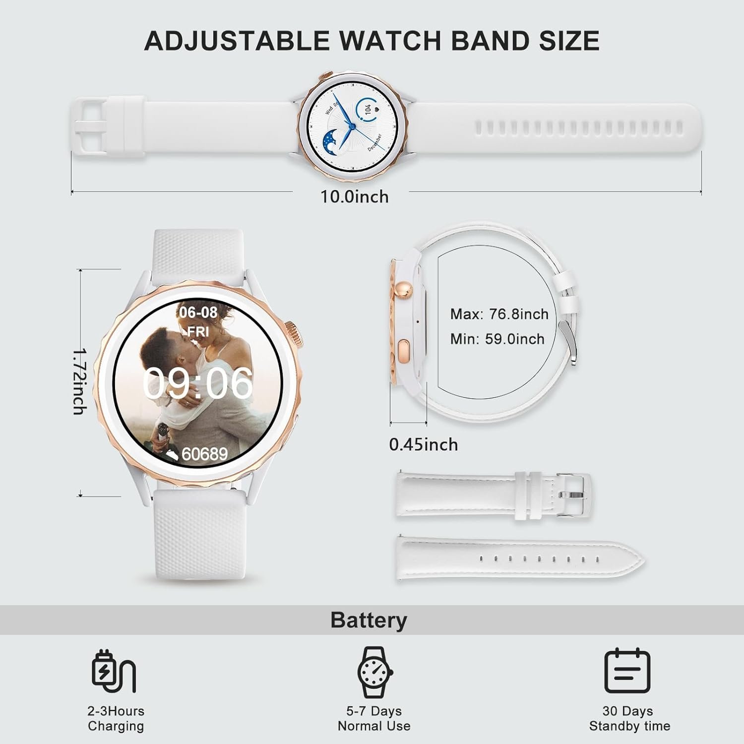 đăKind tipsă:To prolong the life of the battery, make sure to fully charge the watch when you use it for the first time. The products you will receive include: 1 x Bluetooth Smart Watch, 2 x Watch Bands (White Leatherr strap/white silicone strap), 1 x Magnetic Charger Cable,1 x User Manual.watch weight: 1.48 oz. If you have any questions, please feel free to contact us through Amazon, we will answer you within 24 hours.