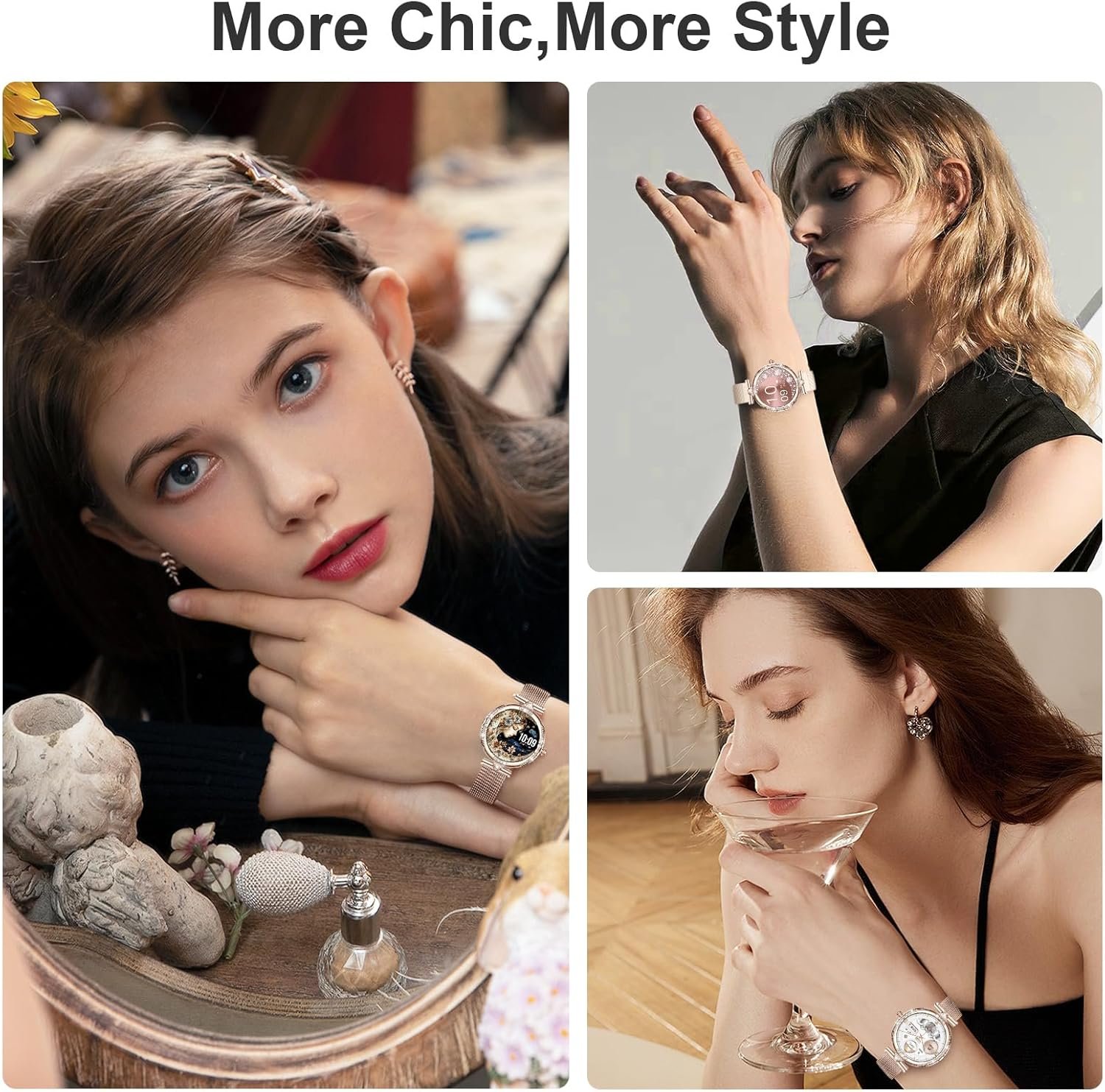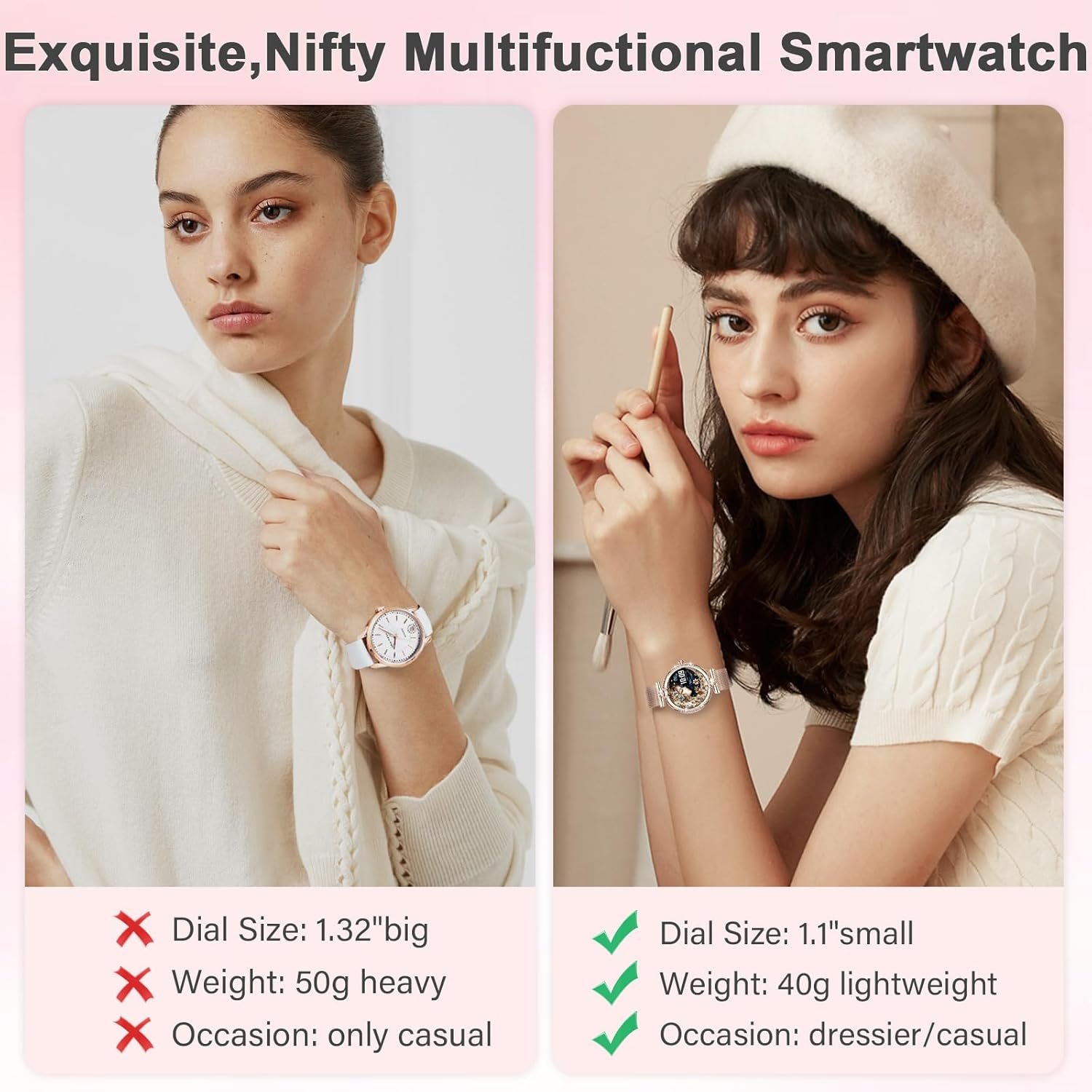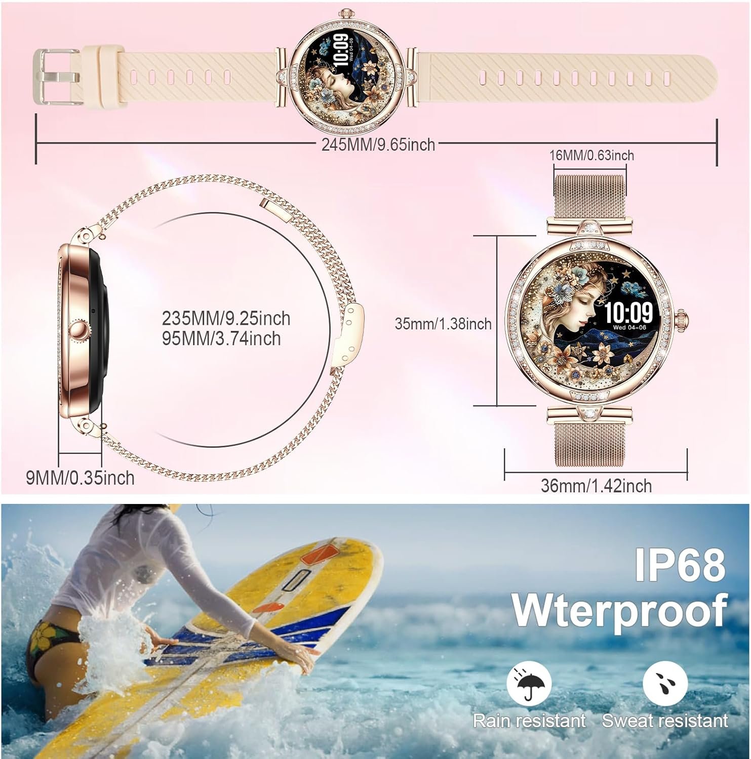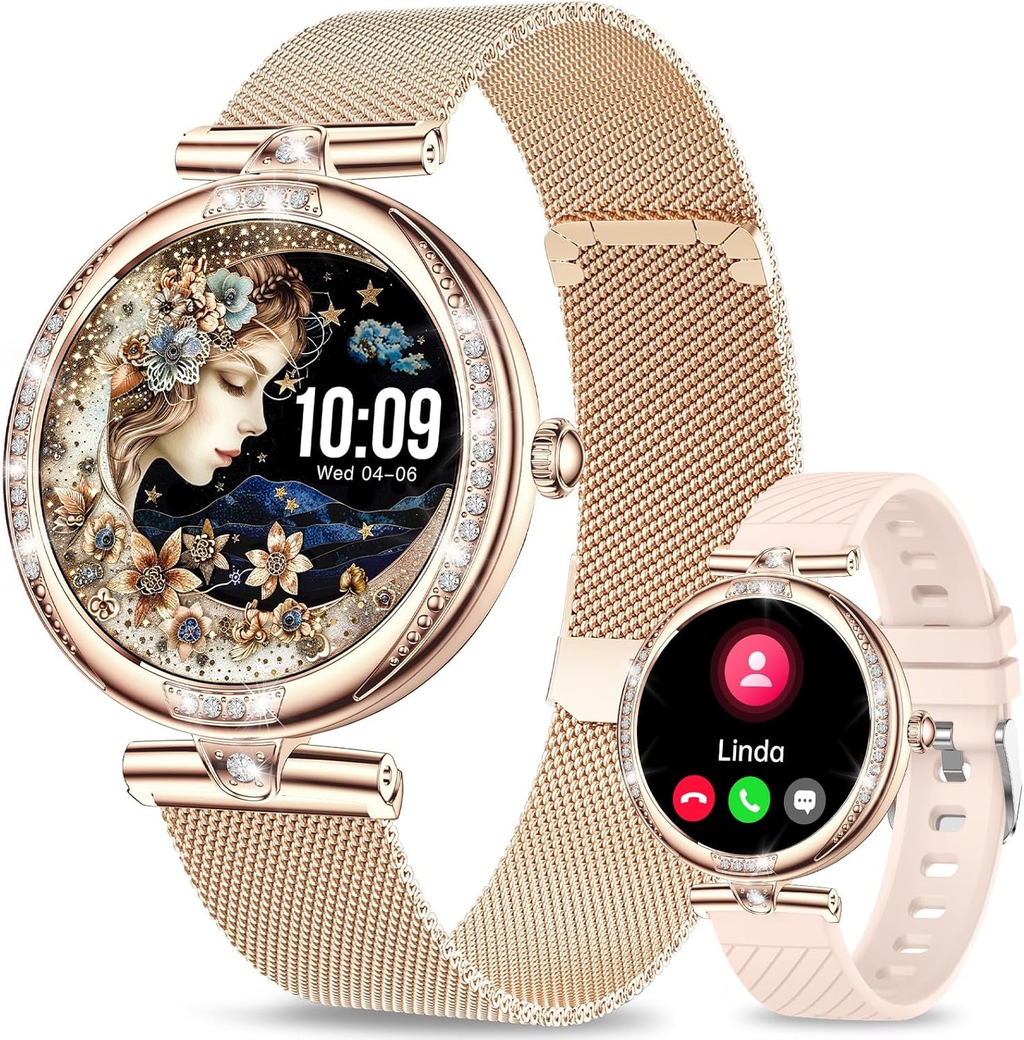😊Two Watch Bands & 100+ Smart Watch Faces:Smart watches for women is equipped with 2 different style straps,1 stainless steel band and 1 silicone blush pink band ,stainless steel strap perfectly enhance the stylish of the overall dressier outfit,silicone fit for the acsual occasions.Smart watch for android contains more than 100+ dials readily available to choose used in the app.besides,You can also DIY watch faces as a watch wallpaper with your favorite photos,your pet,relatives or boyfriend.