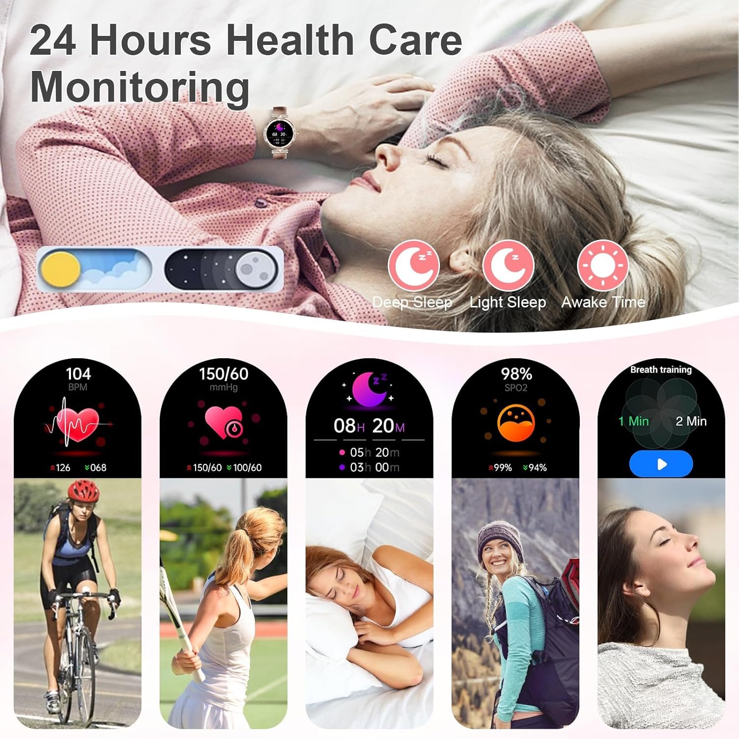 🤰24H Health Care Monitor: Smart watches for women use advanced optical sensors,allowing ladies smart watch to real-time monitor health data,such as heart rate,blood oxygen (Sp02),blood pressure throughout the day.helping you understand your health gererally.Fitness tracker women smart watch for women can automatically monitor your sleep status (deep sleep,light sleep, awake) and You can get more health details through the “FitCloudPro”,women smart watch can also record a women’s menstrual period for thoughtful menstrual management.