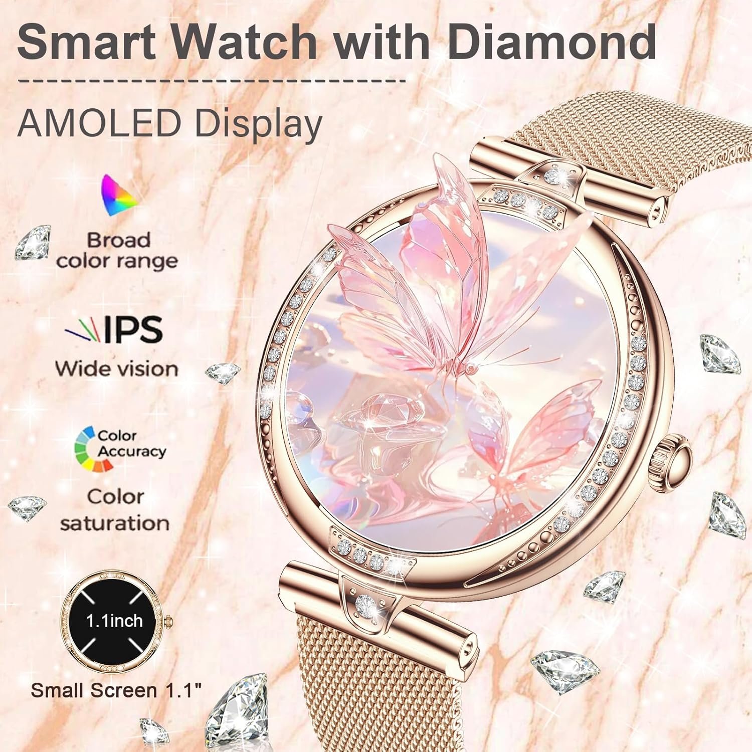 ⌚1.19″AMOLED Smart watches for Women: Smart watch women with 1.1″full touch screen slide smoothly and display clear and colorful,delicate and compact, adjustable brightness providing you with a better visual and operating experience, the AMOLED screen allows you to easily read information in the sun or dark, women samrt watch is embellished with 32 brilliant diamonds,perfectly enhance the stylish of the overall dressier outfit.