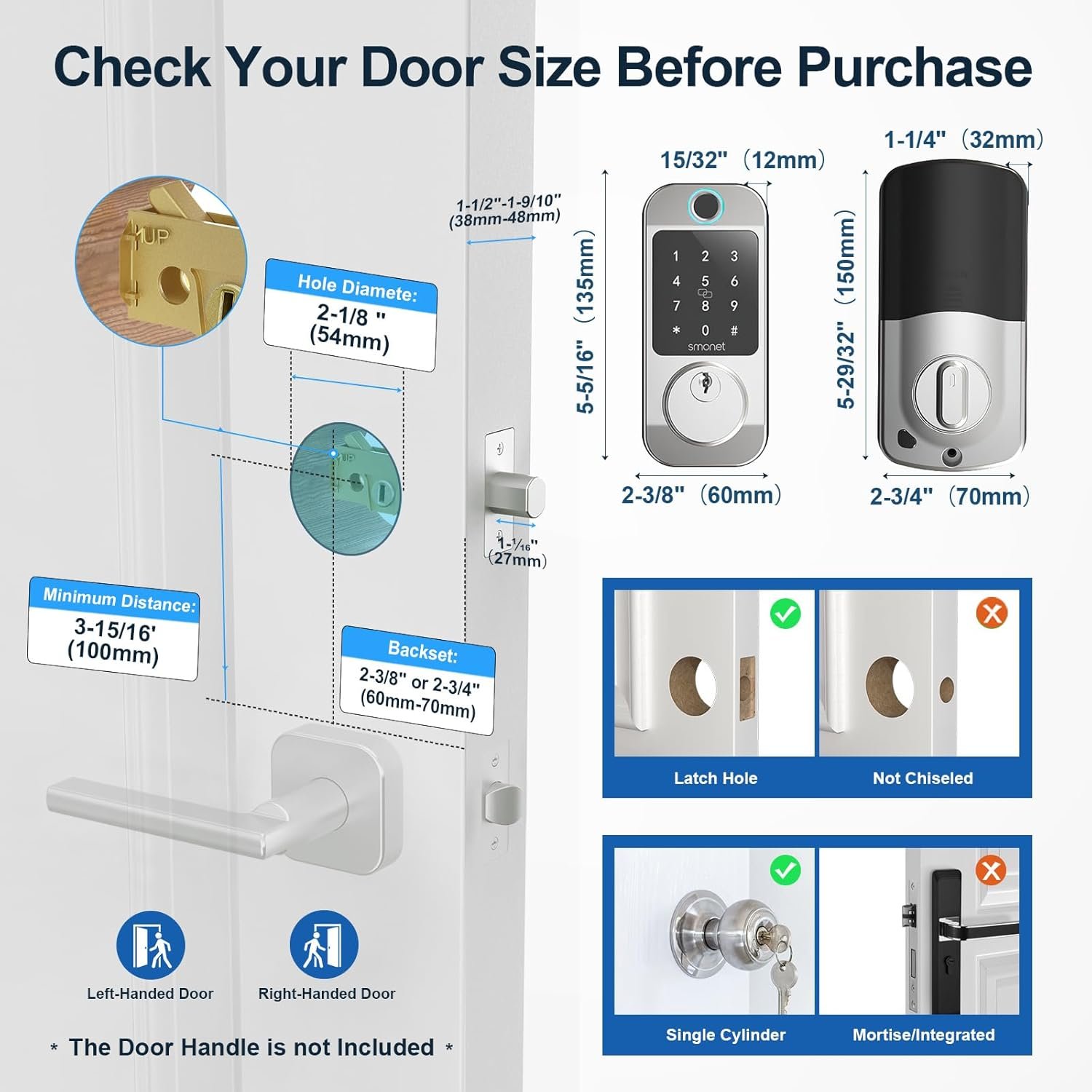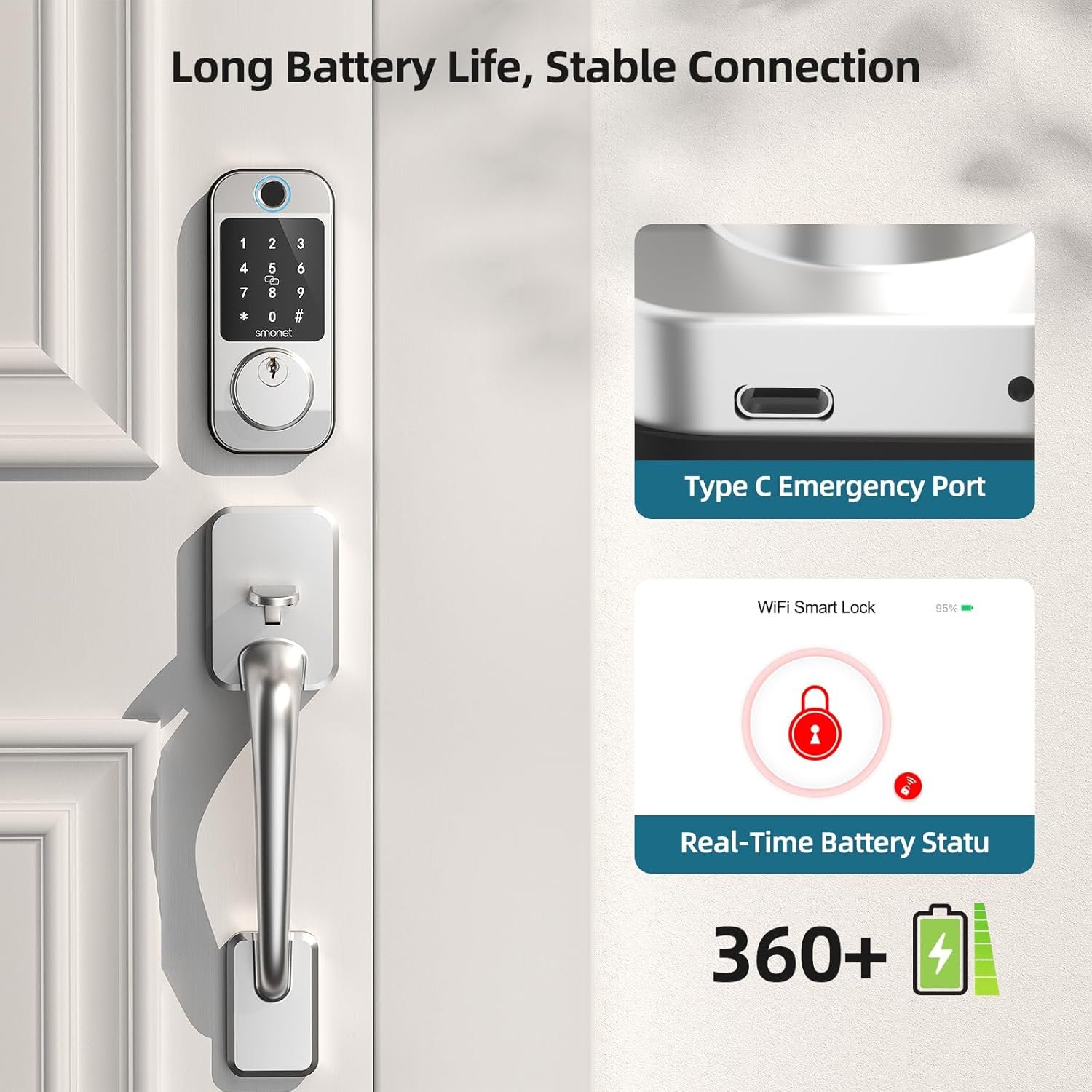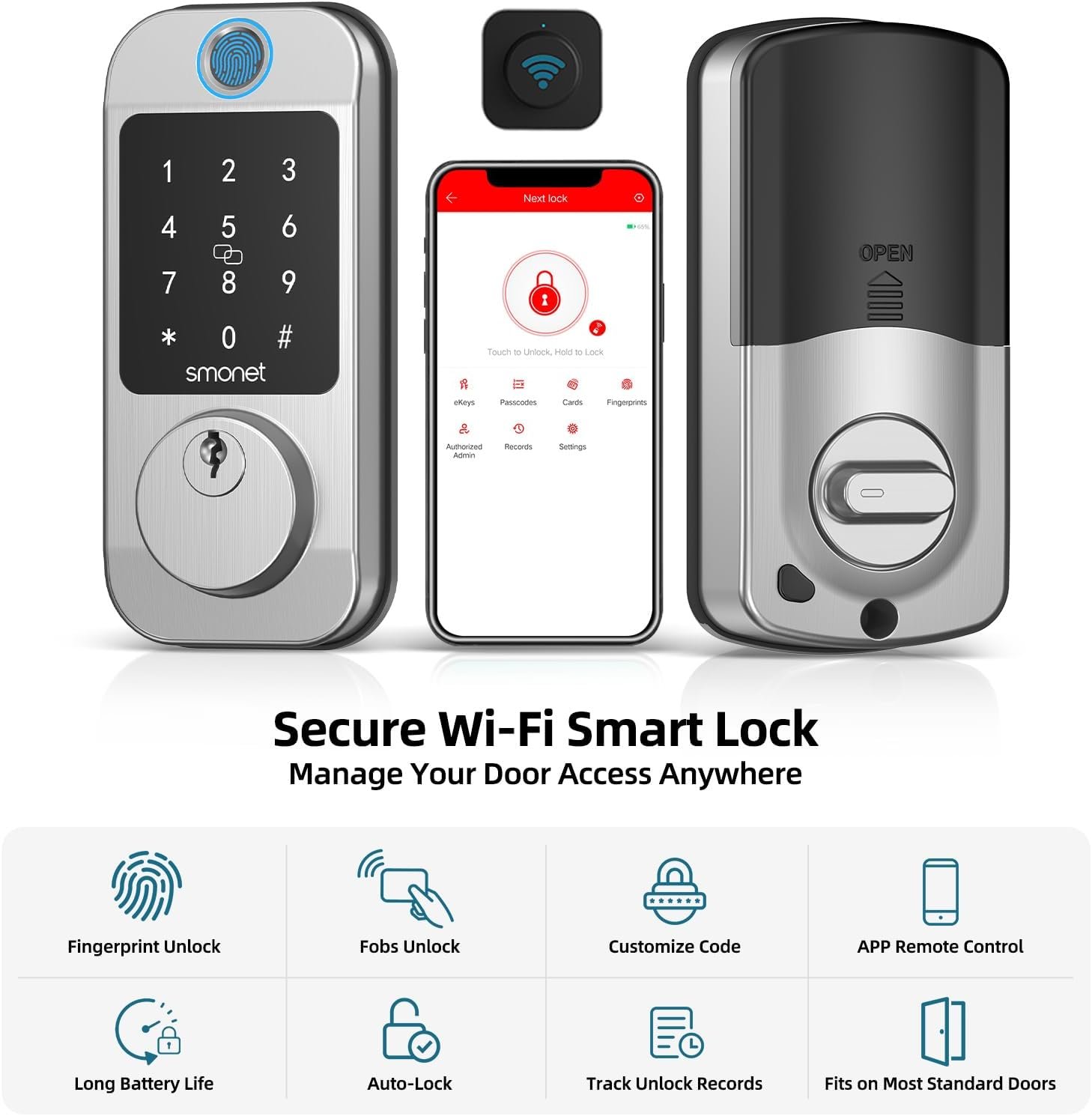 All Kinds of Access Password: SMONET keyless entry door lock deadbolt offers customized, one time, permanent. Additionally, digital door lock also secured with anti-peep codes where you can input numbers before or after the correct code to prevent others from peeping. Suitable for front door, garage door, exterior door.
