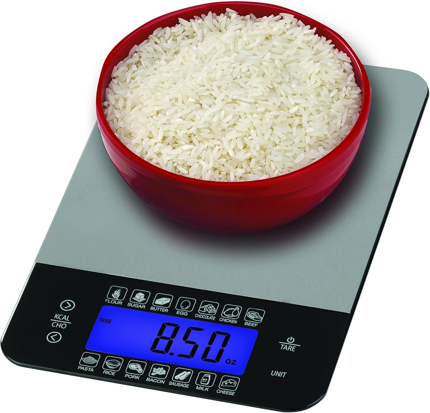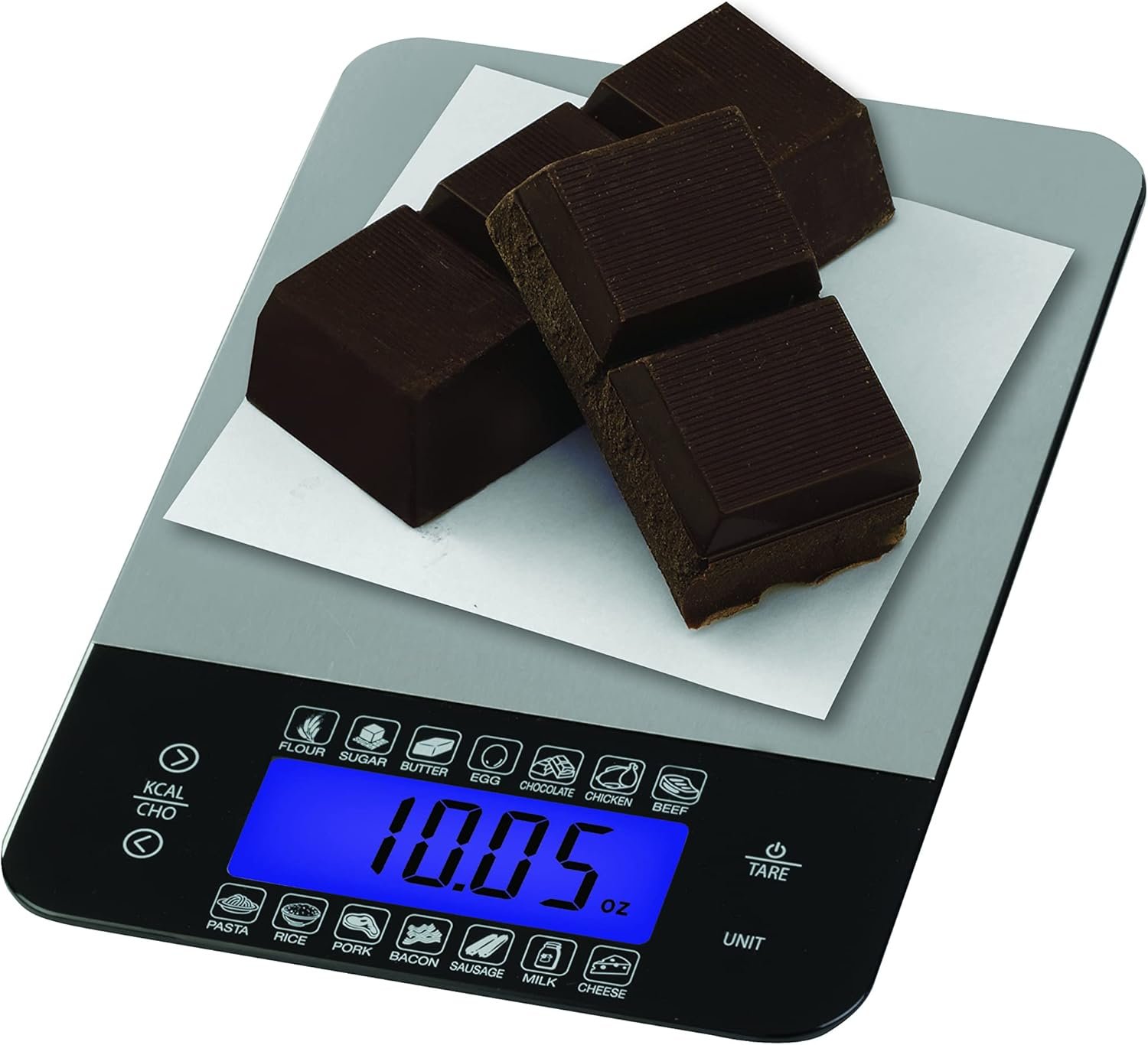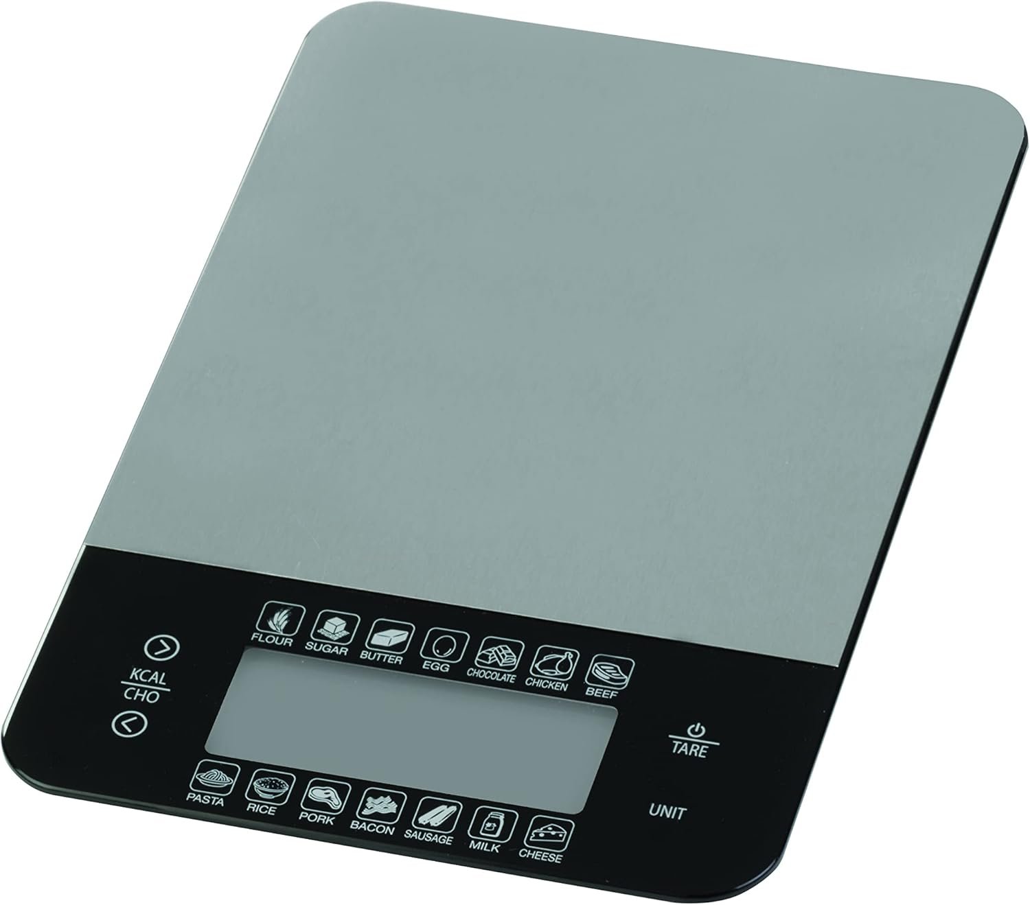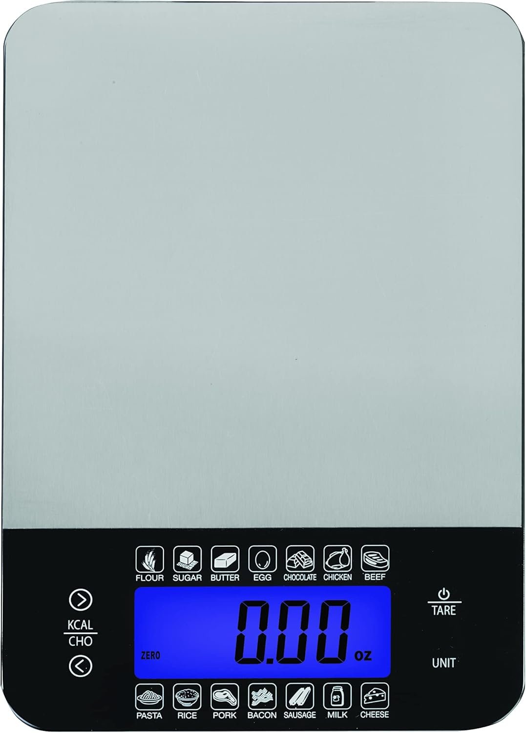This Kitchen Food Scale, with calorie and carb calculator, has a stainless steel platform and is accurate and easy to use in ounces, pounds, grams, or milliliters