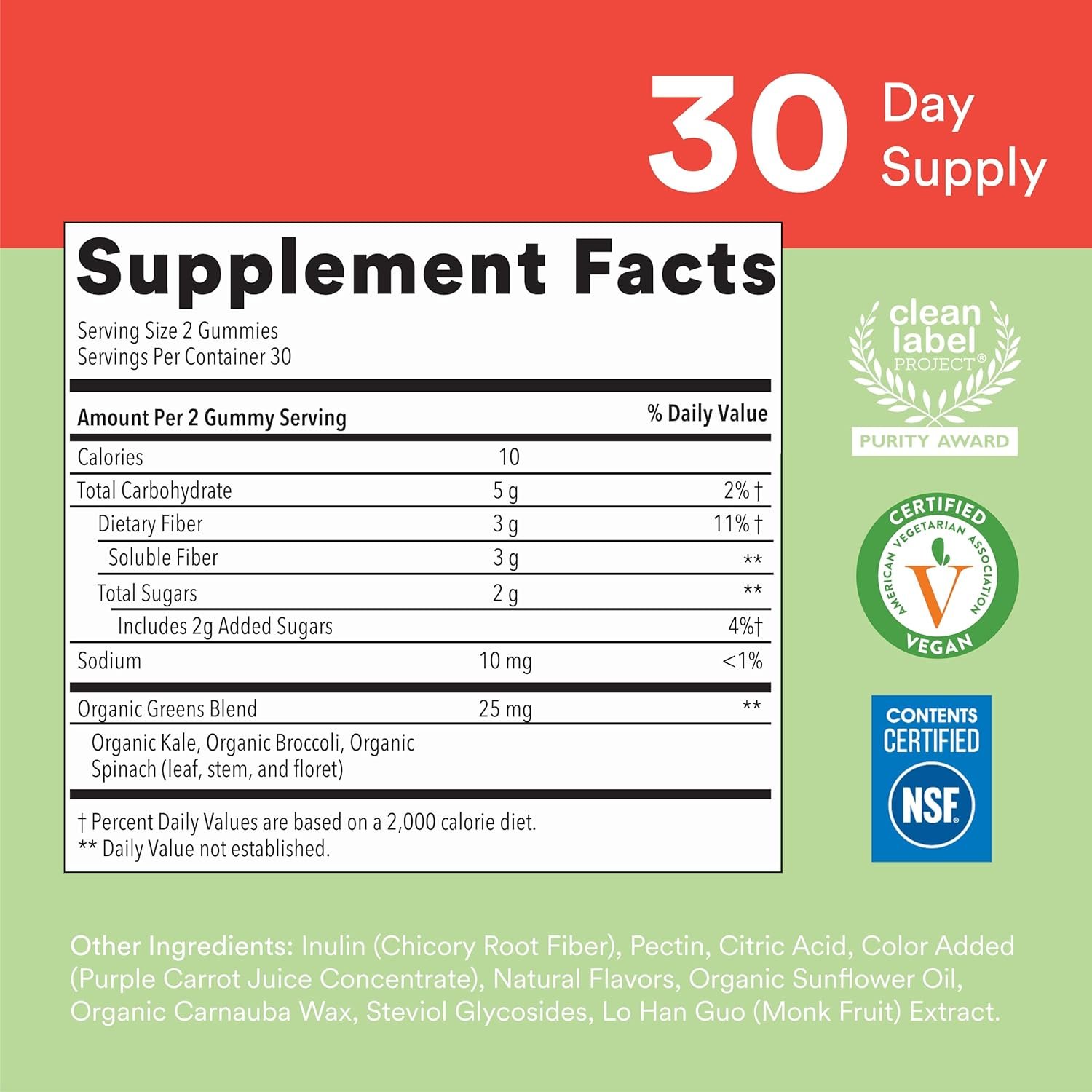 SmartyPants Kids Fiber & Veggies is a prebiotic fiber supplement gummy for kids that contains 3 g of prebiotic dietary fiber, inulin, and an organic green veggie blend of organic kale, spinach, and broccoli in every serving. Our science-backed formula supports regular digestion* and uses nutrient forms that your child’s body can easily use to help to fill nutritional gaps. SmartyPants supplements are non-GMO, Free From the top 9 major allergens, gluten-free, and made with natural flavors.