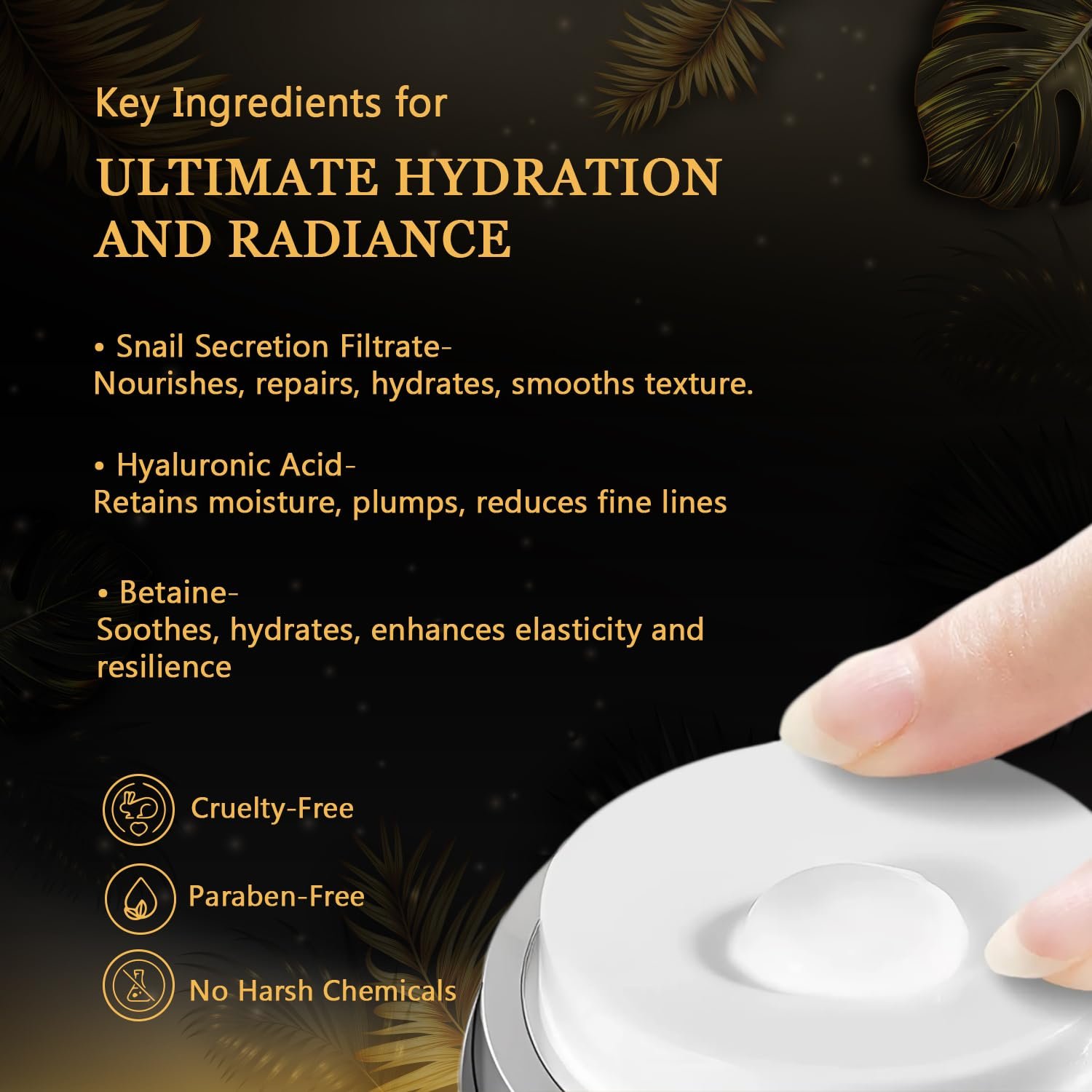 NATURE’S SECRET FOR RADIANT SKIN: Anti-aging skin repair cream is packed with powerful ingredients that work together to improve skin elasticity, and reduce the appearance of wrinkles. Infused with Snail Secretion Filtrate, Sodium Hyaluronate, and Betaine, it deeply nourishes and illuminates your skin, leaving you with a radiant, youthful glow.