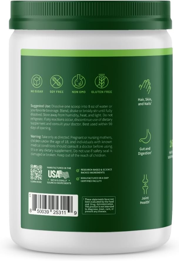 Highest Quality Ingredients: Collagen Peptides, Organic Turmeric, Wheatgrass, Spirulina Algae, and more. Manufactured in a FDA registered and GMP certified facility.