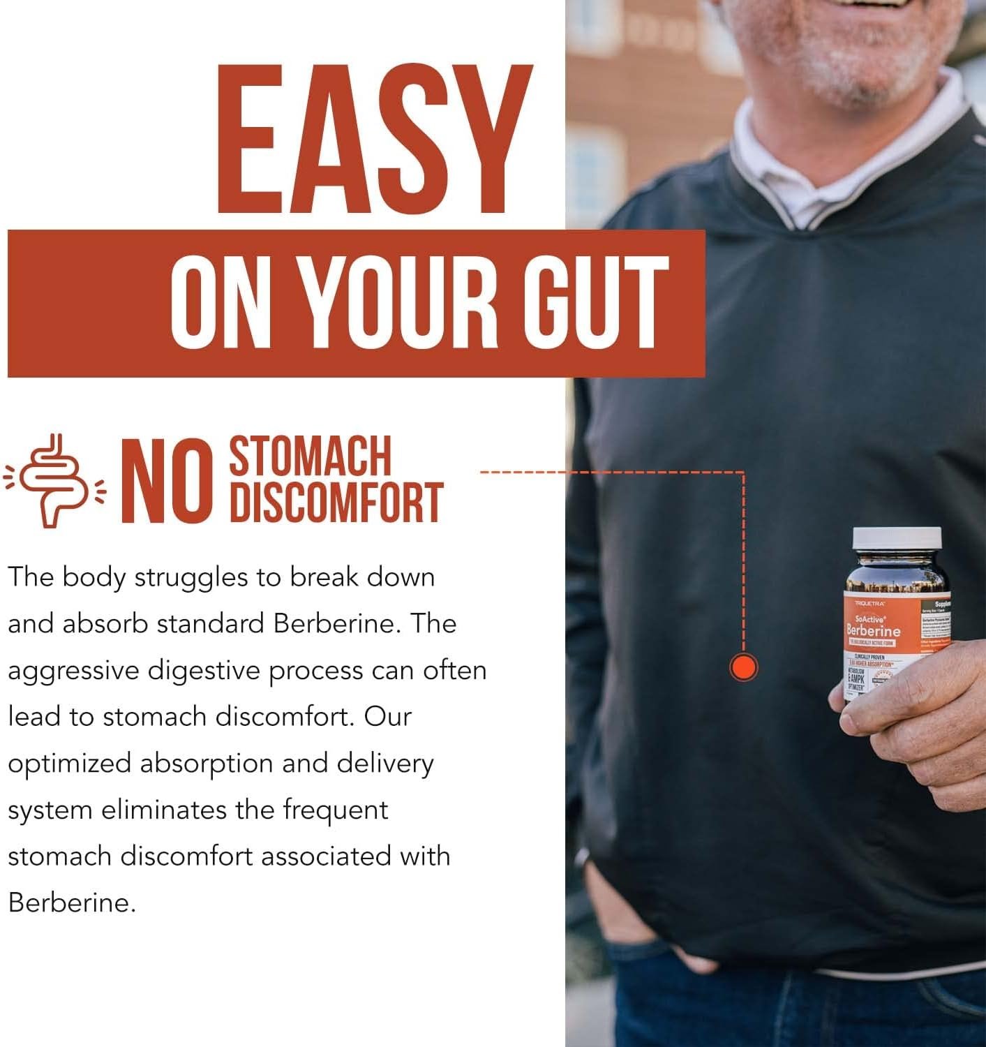 NO STOMACH DISCOMFORT: The body struggles to breakdown and absorb standard Berberine; the aggressive digestive process can often lead to stomach discomfort. Our optimized absorption and delivery system eliminates the frequent stomach discomfort associated with Berberine.