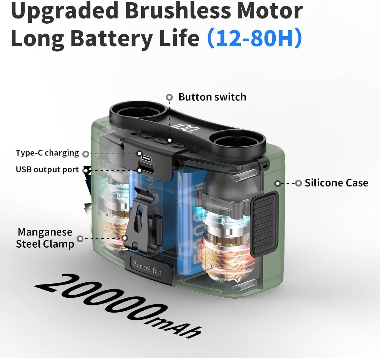 【With Silicone Cover, Non-Slip and Anti-Drop】Our mini portable waist clip fan is designed for various outdoor usage scenarios, catering to occupations like workers and farmers. It comes with a high-quality protective silicone leather case which protects from shock when dropped and ensures the body fan is not damaged at all. The upgraded Manganese steel clamp provides stronger gripping force, always keeping the wearable fan firmly, and is more durable. Practical design with two clips facing opposite directions allows for more placement options