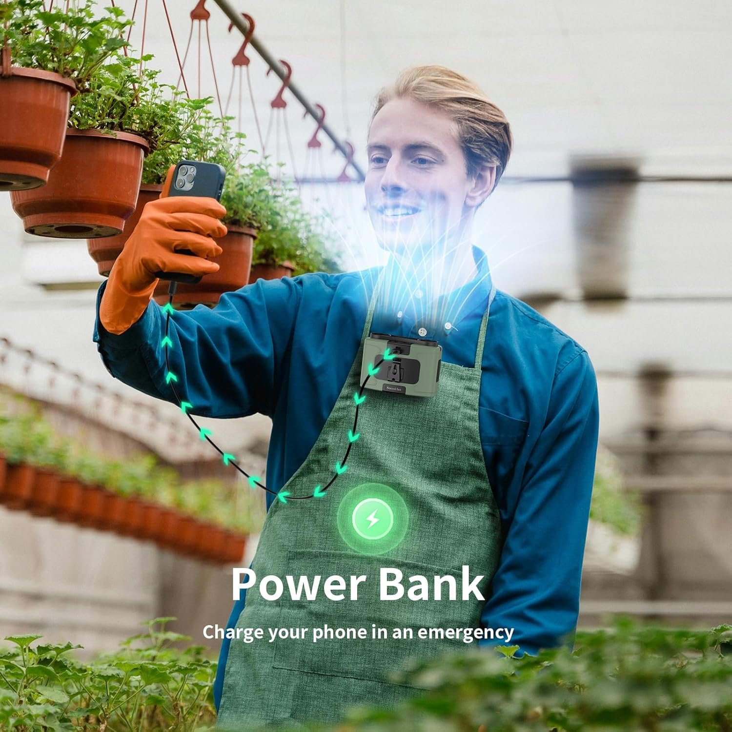 【5 in 1 Multifunctional Waist Clip Fan】An integrated waist clip fan, desk table fan, handheld fan and neck fan. You can clip belt fan to your shirts, belt, or pants, or you can hang the personal fan around your neck with the lanyard. With a bracket on the fan clip, you can put USB fan on the desk. It can be used as an emergency power bank to directly charge a mobile phone, with no more fear of running out of phone battery