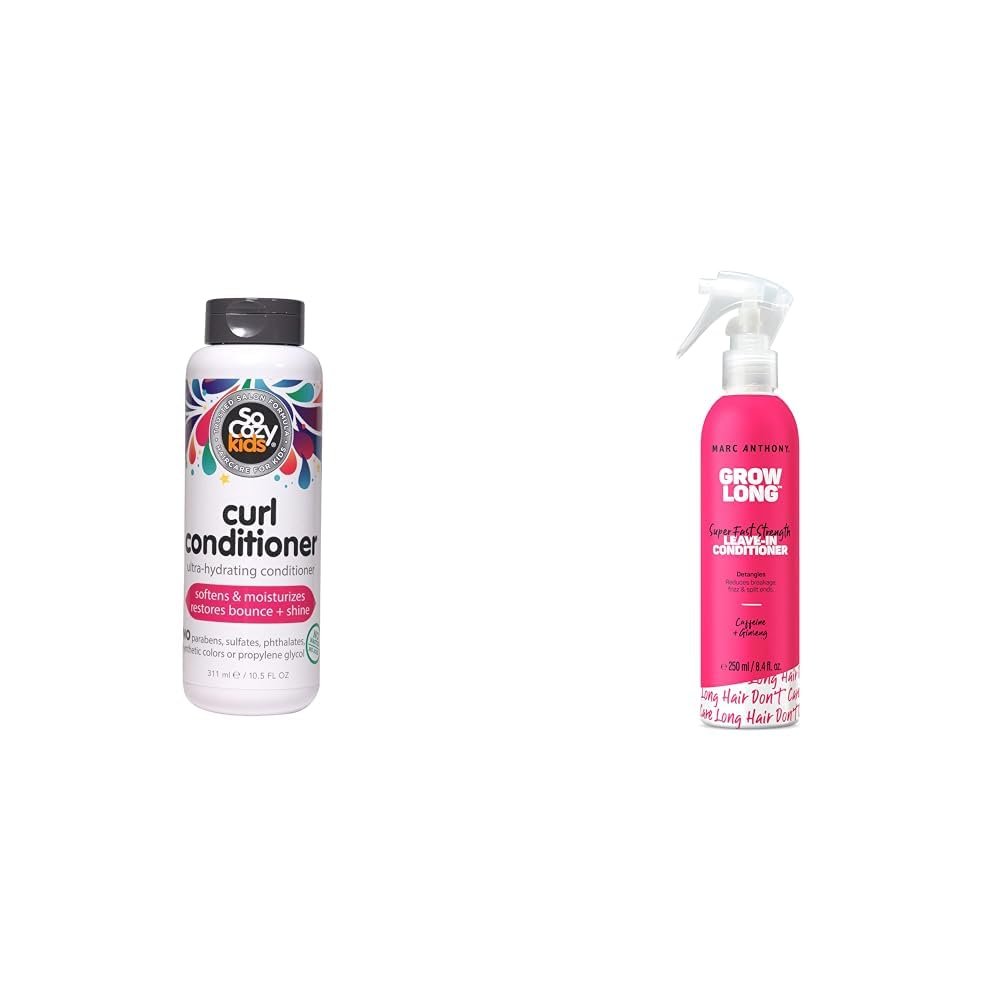 Get soft, detangled curls and long, strong hair with this bundle containing SoCozy Curl Conditioner and Marc Anthony Leave-In Conditioner. The SoCozy Curl Conditioner is a 10.5 fl oz creamy formula made specifically for kids’ hair. It uses mango seed butter, rice protein, and papaya extract to penetrate dry, tangled curls to restore bounce and shine without weighing hair down. This conditioner is free of parabens, sulfates, phthalates, synthetic colors, gluten, wheat, nuts, and other harsh ingredients. Complement the SoCozy conditioner with the Marc Anthony Leave-In Conditioner containing caffeine, ginseng, and vitamin E. This 8.4 fl oz spray-on formula smooths hair and helps reduce split ends and breakage. It moisturizes and strengthens all hair types, promoting growth for longer, healthier looking hair. Like the SoCozy formula, this leave-in conditioner is also free of parabens, sulfates, phthalates, and other undesirable ingredients. With one conditioner tailored for kids’ curls and another fortifying all hair types, this bundle offers a comprehensive hair care solution. The SoCozy Curl Conditioner softens and detangles, while the Marc Anthony Leave-In Conditioner strengthens against breakage – together working to reveal beautiful, healthy hair.