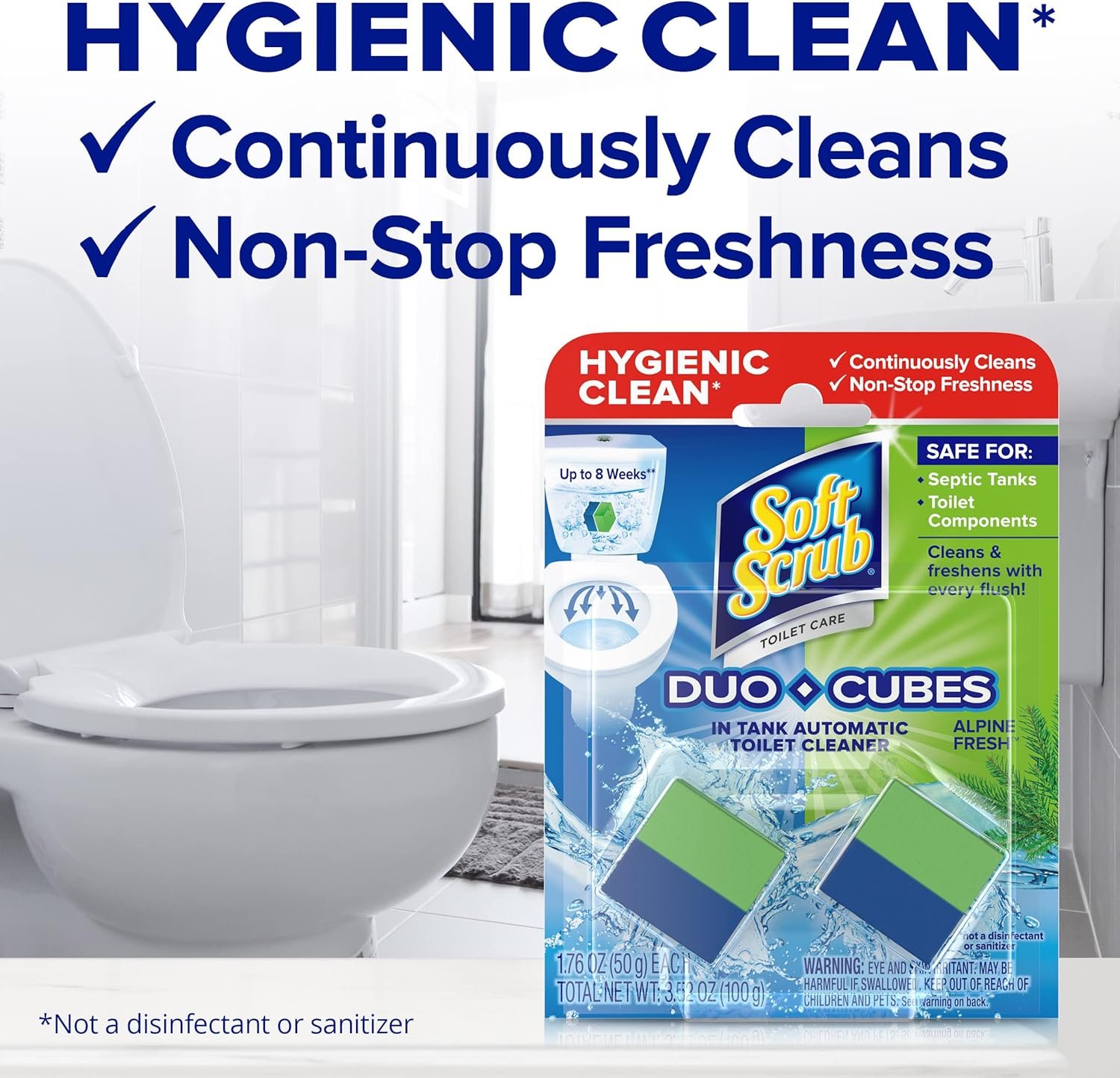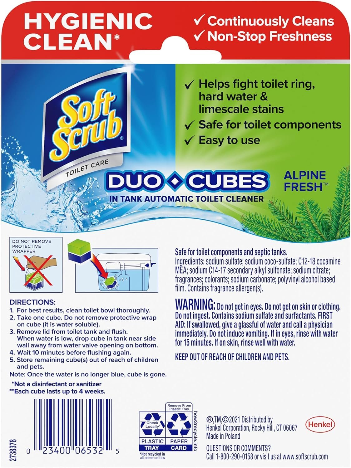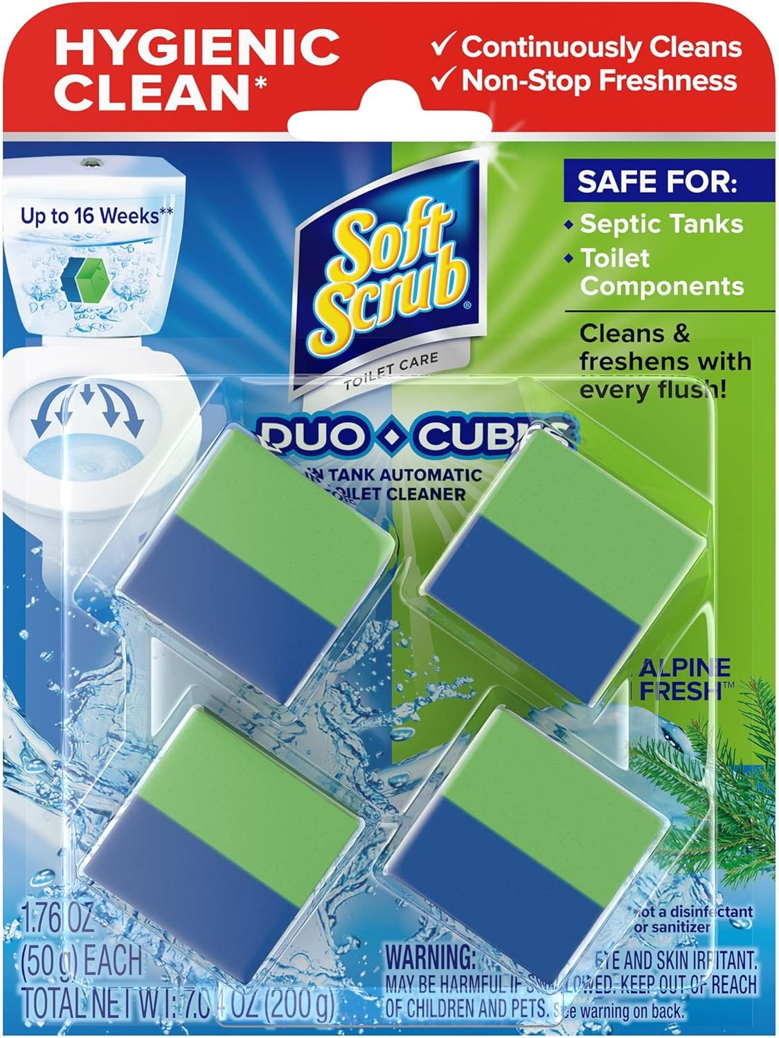 Soft Scrub Duo-Cubes in-tank automatic toilet cleaner helps fight toilet ring, hard water, and limescale stains. Soft Scrub Duo-Cubes are easy to use and safe for toilet components. Just drop a Soft Scrub Duo-Cube in the tank and enjoy cleaning and freshening benefits for up to four weeks!
