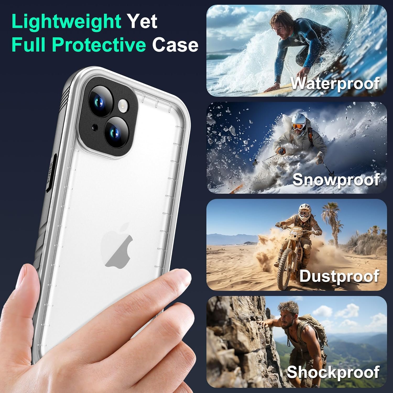 𝟑𝟔𝟎° 𝐅𝐮𝐥𝐥 𝐁𝐨𝐝𝐲 𝐏𝐫𝐨𝐭𝐞𝐜𝐭𝐢𝐨𝐧 & 𝐃𝐮𝐬𝐭𝐩𝐫𝐨𝐨𝐟 𝐏𝐨𝐫𝐭: The full body protective phone case is front and back two-piece sealed cover and the charger port designed with rubber 𝐩𝐥𝐮𝐠 𝐜𝐨𝐯𝐞𝐫 𝐭𝐨 𝐛𝐥𝐨𝐜𝐤 𝐝𝐮𝐬𝐭,𝐬𝐚𝐧𝐝 𝐚𝐧𝐝 𝐥𝐢𝐪𝐮𝐢𝐝𝐬. Not just shockproof, it gives your phone a comprehensive 𝐰𝐚𝐭𝐞𝐫𝐩𝐫𝐨𝐨𝐟, 𝐫𝐚𝐢𝐧𝐩𝐫𝐨𝐨𝐟, 𝐝𝐮𝐬𝐭𝐩𝐫𝐨𝐨𝐟, 𝐬𝐧𝐨𝐰𝐩𝐫𝐨𝐨𝐟, 𝐚𝐧𝐝 𝐝𝐢𝐫𝐭𝐩𝐫𝐨𝐨𝐟 𝐩𝐫𝐨𝐭𝐞𝐜𝐭𝐢𝐨𝐧. Also, the washable design makes it perfect for various outdoor activities and environments, from dust storms to snowy terrains and beaches, any dust or dirt on case, flush it with water, always keep your phone and case looking new