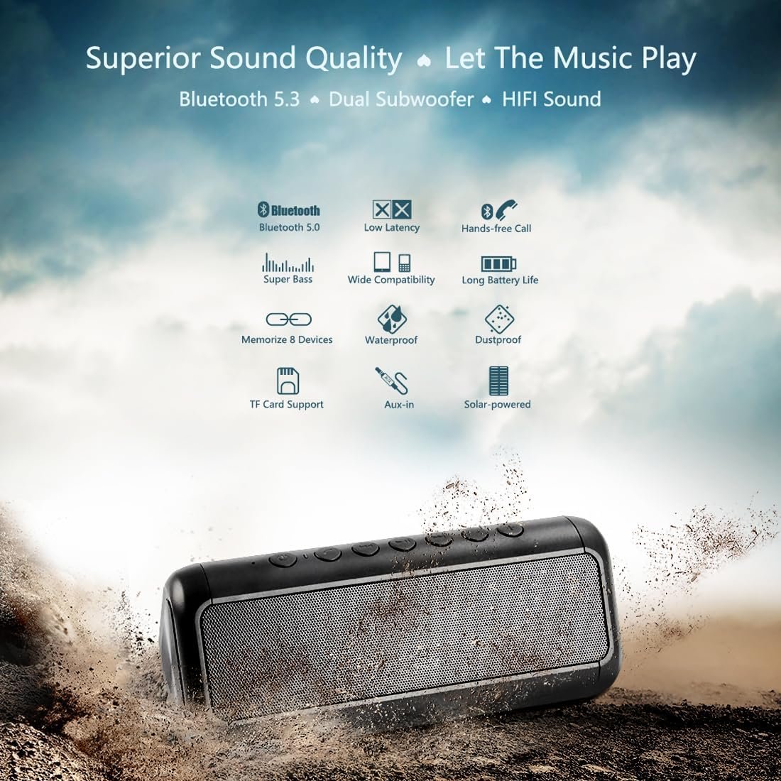 50+Hour Playtime HD Stereo Sound Portable Wireless Bluetooth 5.3 Speaker for Cellphone, iPad, iPhone,Tablet and more.It has a built-in 5000 mAh mobile power supply and solar charging. You no longer need to worry about running out of power. If your phone is exhausted, you can use it to charge your phone.