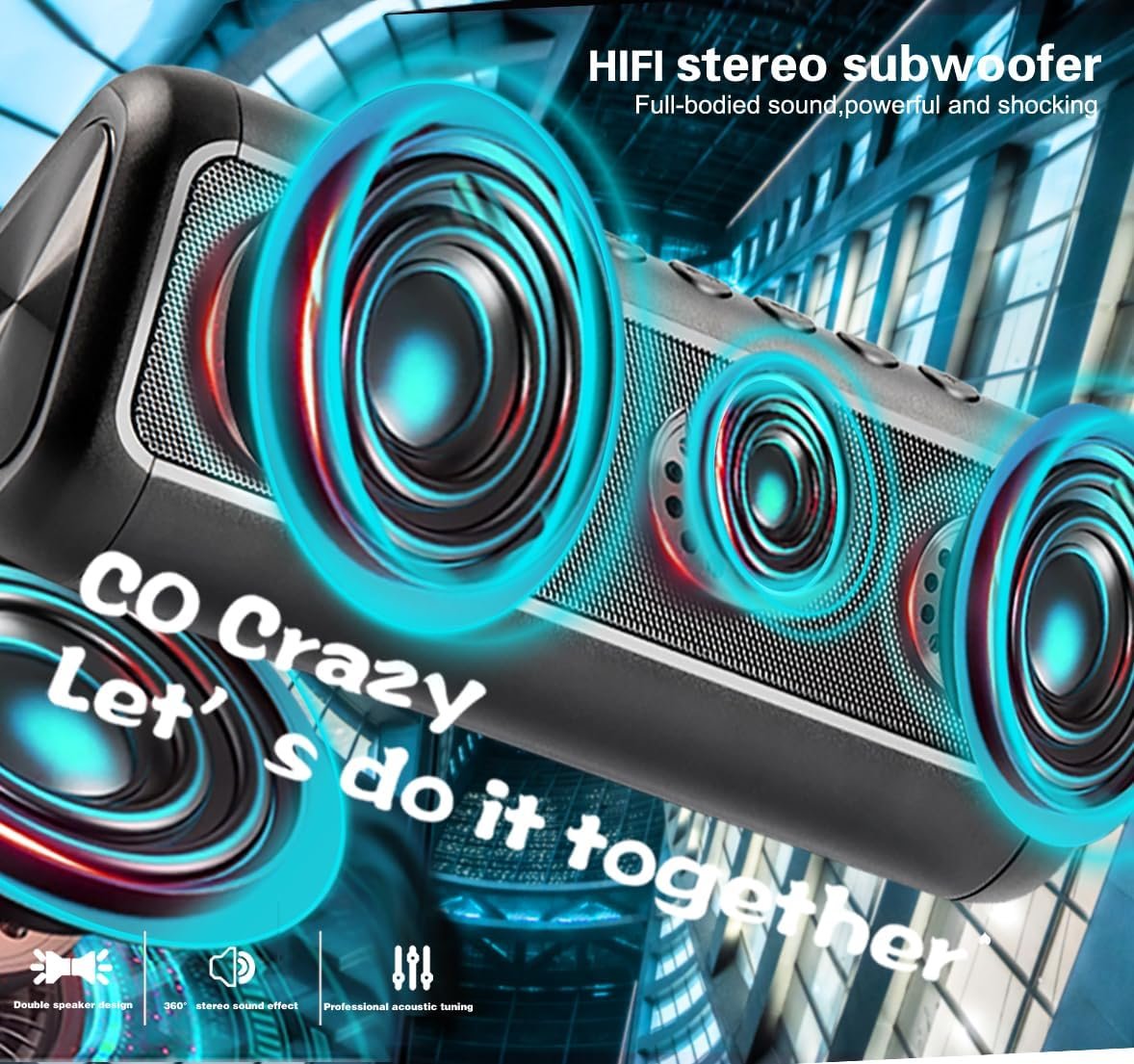 Featuring dual high-performance drivers and advanced Bluetooth 5.3 technology, this wireless Bluetooth speaker delivers powerful, well-balanced sound that produces stunning 3D stereo sound with virtually no distortion, allowing you to experience unrivalled sound quality and an immersive sound experience, with an advanced Digital Signal Processor that ensures stunning stereo sound at any volume! With less than 1% Total Harmonic Distortion (THD), enjoy 360° surround sound for an immersive sonic experience at home or outdoors. Compatible with mobile phones, iPads, iPhones and all Bluetooth devices, also connects to non-Bluetooth devices via audio cable.
