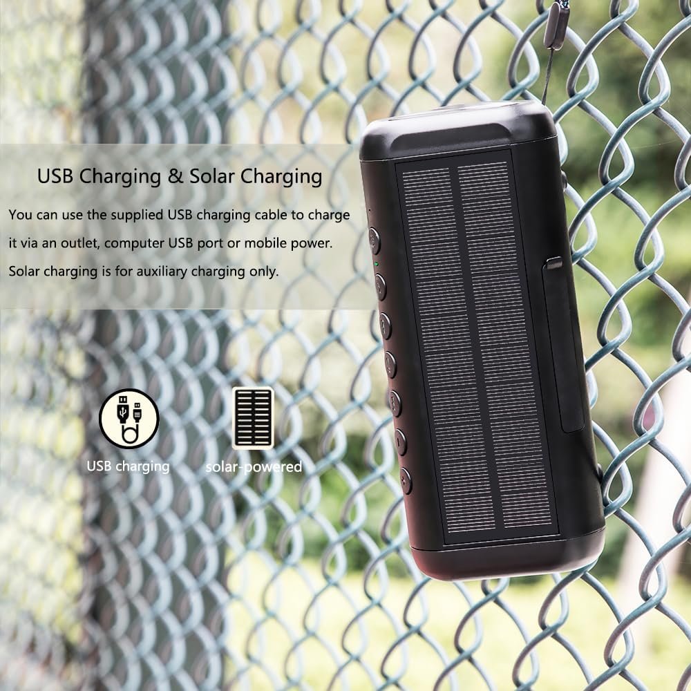 ☀【2 Charging Modes】: 1. You can charge it via the included USB/Type-C charging cable through an outlet, computer USB port or mobile power; 2. Solar charging system as an auxiliary supplemental charging function (due to the solar charging speed is very slow, it can only be used as an auxiliary supplemental charging), it can’t be used for the main charging purpose, when you are barbecuing, camping, hiking, mountaineering, cycling and other outdoor activities, it can be more convenient to supplement more power for the speaker.