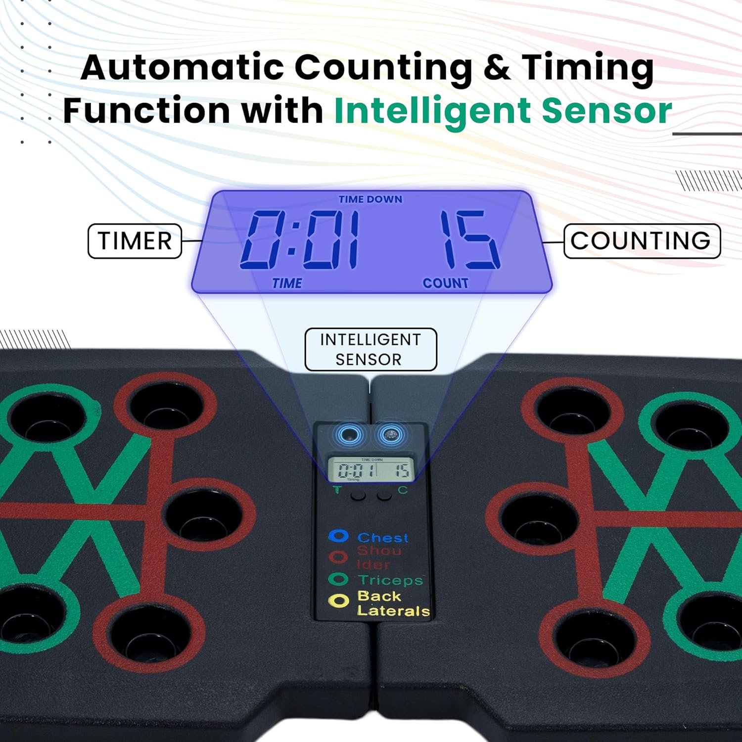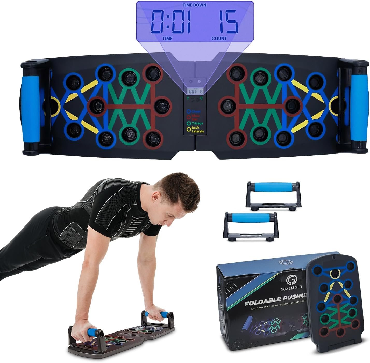 Smart Counter: Push up board with high-definition display, sensitive & precise sensors, automatically track the number of push-ups you do and time. Goal Moto Push Up Board for Men features 3 smart counting methods to help you constantly challenge your system for maximum fat burning. Counter uses 2 pcs AAA batteries (not included)