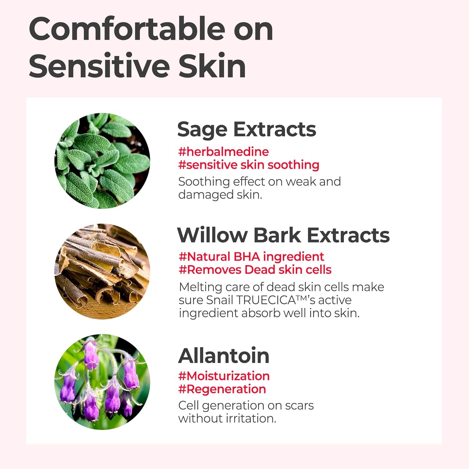 SNAIL TRUCICA LINE : SNAIL TRUCICA LINE is designed to improve skin health by using Snail Truecica formula. Snail mucin contains hyaluronic acid, glycoproteins, and proteoglycans, which help to hydrate the skin, promote collagen production, and reduce inflammation. This Line also contains Truecica, a unique calming agent that soothes sensitive skin caused by external factors. It has passed irritation tests on sensitive skin