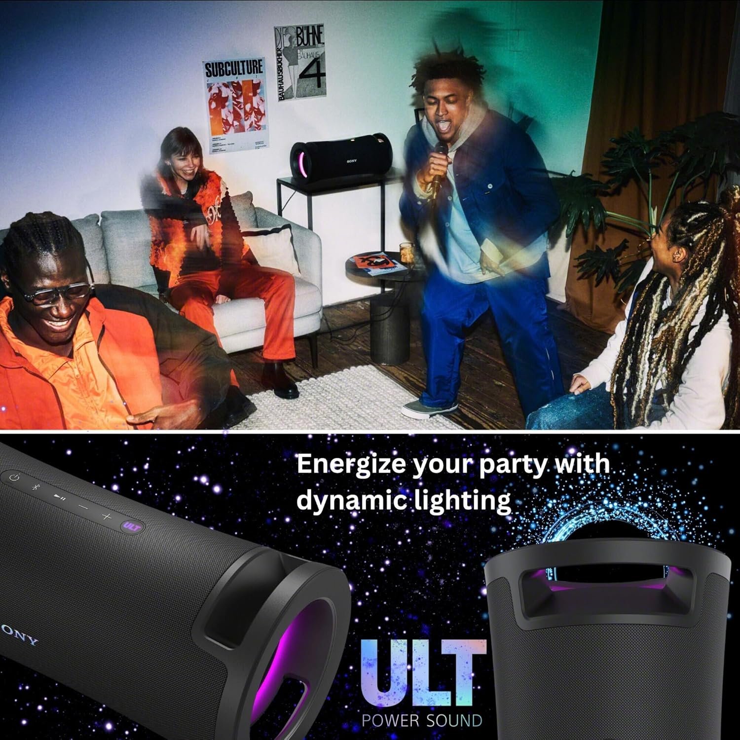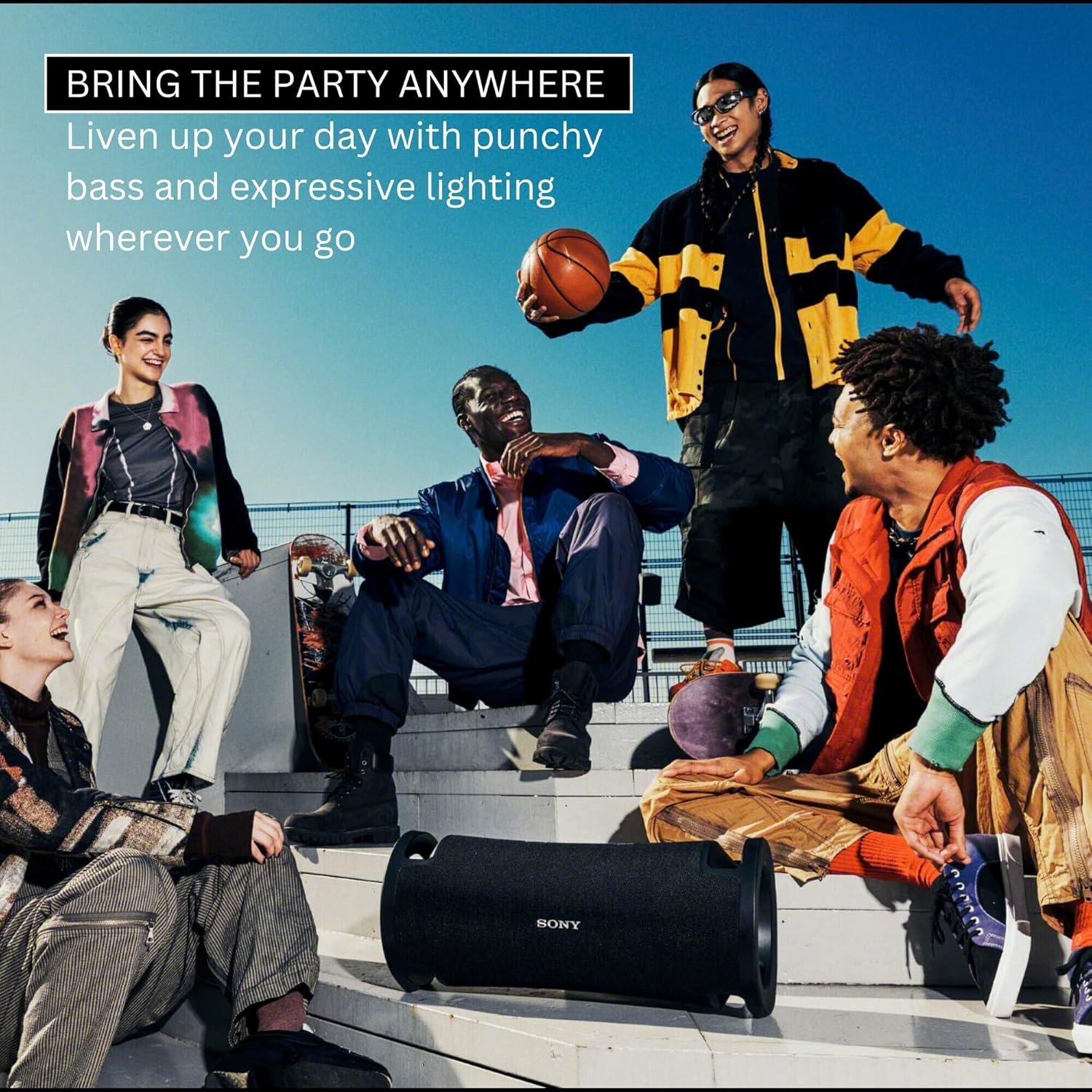 Bring the ultimate vibe with colorful lighting that synchronizes with your music and is easily controlled via the Sony | Music Center app and Fiestable app.