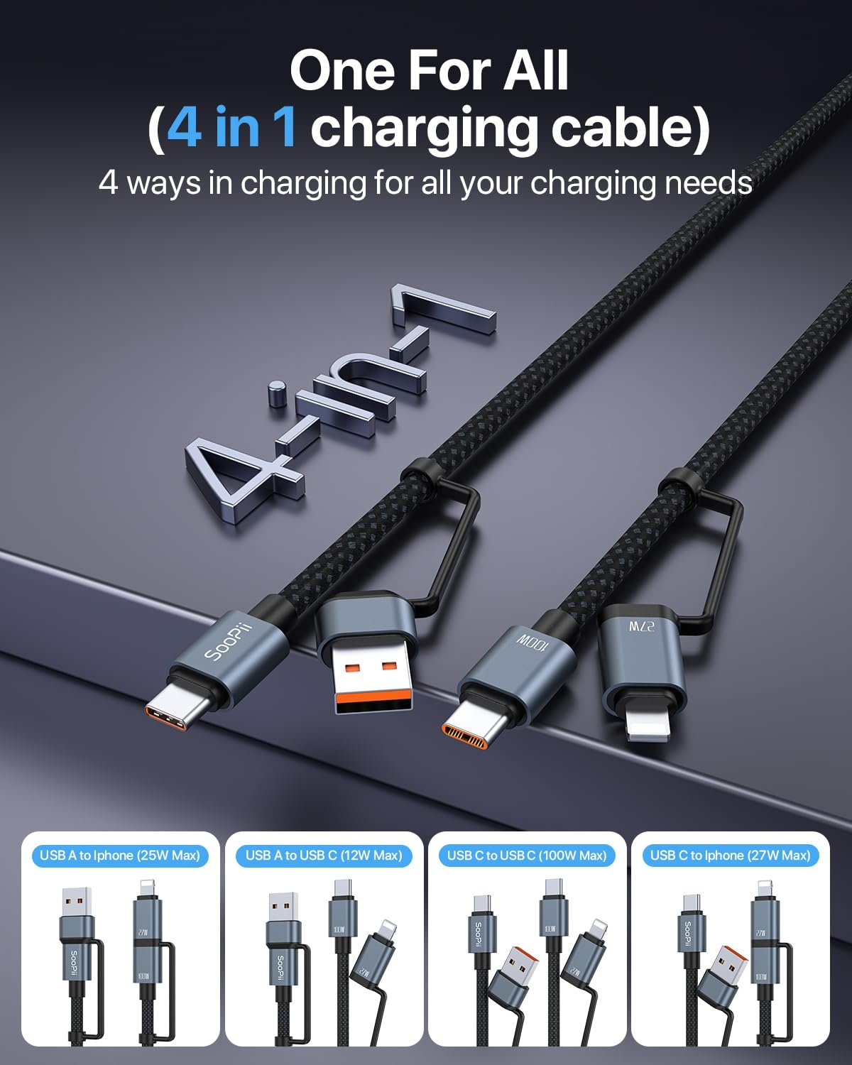 [4 in 1 Multifunctional Charging Cable] Enjoy the convenience of our 4-in-1 charging cable that supports USB A to C, USB A to lphone, USB C to lphone, and USB C to USB C, making it ideal for various devices.Just one cable for all your charging needs.