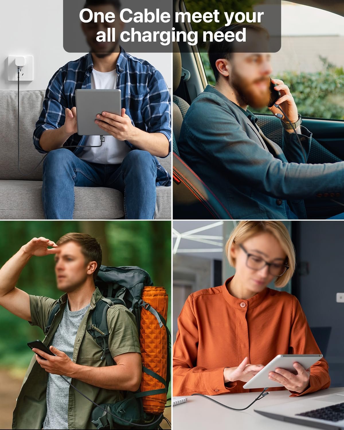 [Wide Compatibility] 4 in 1 USB charging cable works with a wide range of USB-C devices, including smartphones, tablets, and laptops, say goodbye to the clutter cables,making it used freely in the bedroom, office and even in the backseat of your car.