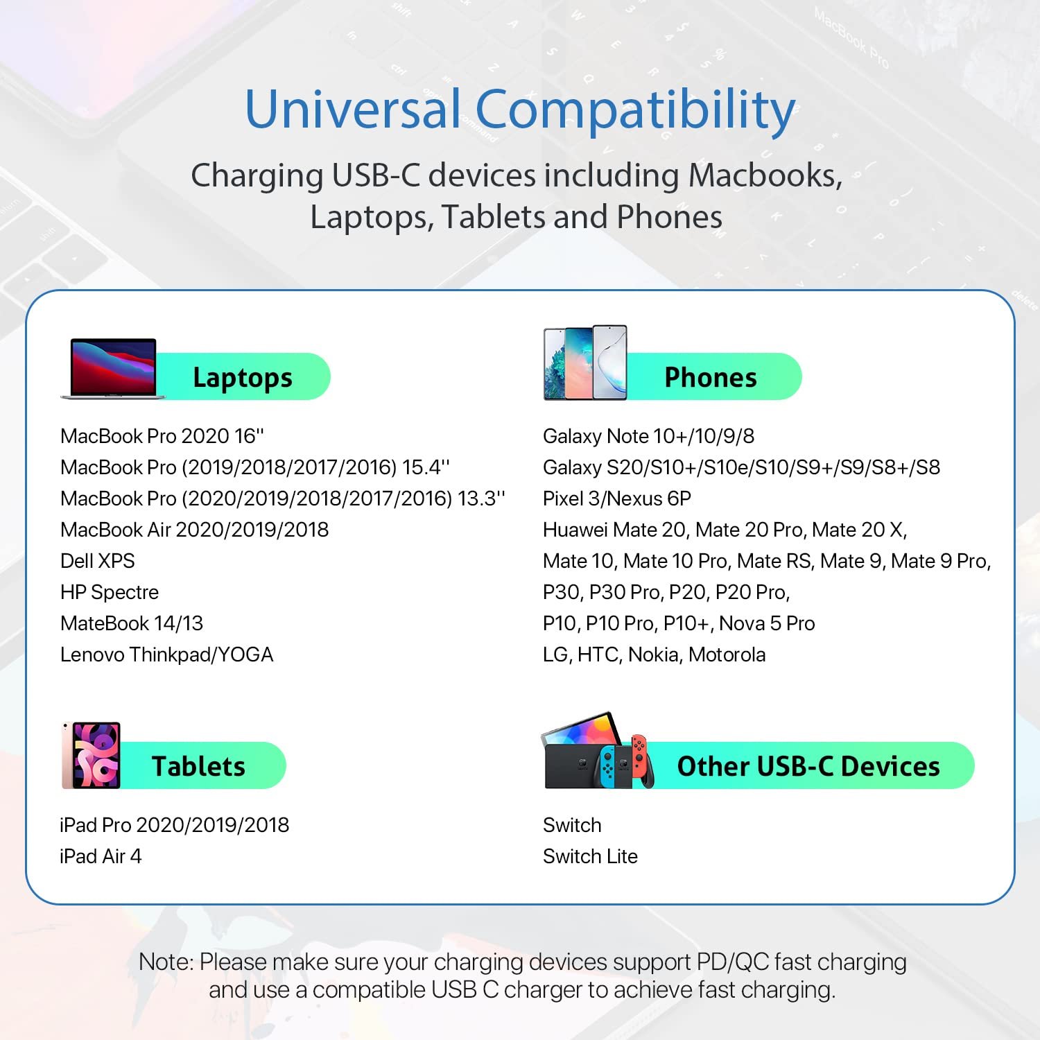 Wide Compatibility: Works effortlessly with any USB-C device including phones, tablets, and laptops. Compatible with MacBook Pro 13”, MacBook Pro 15”, MacBook Air 2018, iPad Air 2020 10.9” (4th generation), iPad Pro 12.9”/11”, for Samsung Galaxy S21/ S21 Ultra/ S20/ S20+/ S20 Ultra/ Note 10/ Note 10 Plus/ , Google Pixel 2/3/3a/4 XL, Switch/Switch Lite and more. ( Note: Please use a 100W USB-C wall charger to achieve fast charging. )