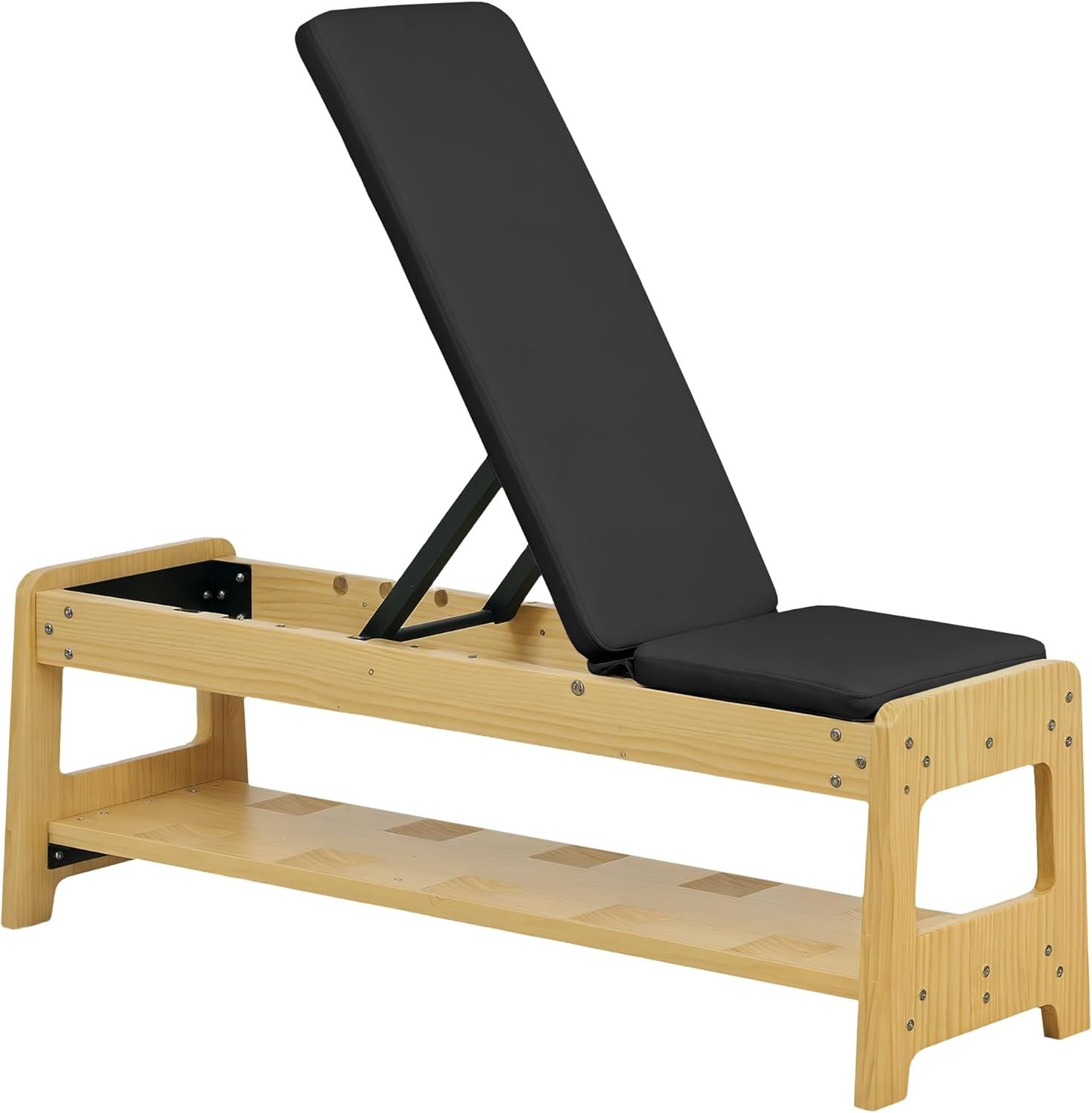 Transform your home workout with the Soozier adjustable bench! This gym bench features a built-in dumbbell rack for five weights and offers six angles for everything from flat presses to inclines. Enjoy comfort with padding and easy-to-clean faux leather, all while saving space with its sleek, natural wood design. Great for any fitness enthusiast’s home gym setup.