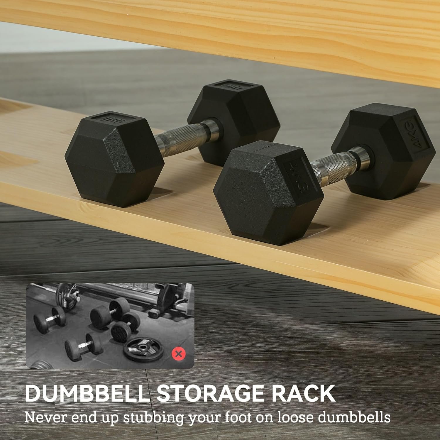 ● Natural wood dumbbell bench adds a stylish touch to home gyms
