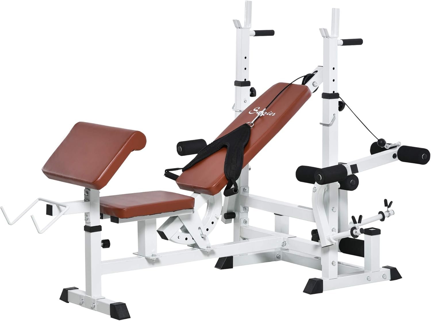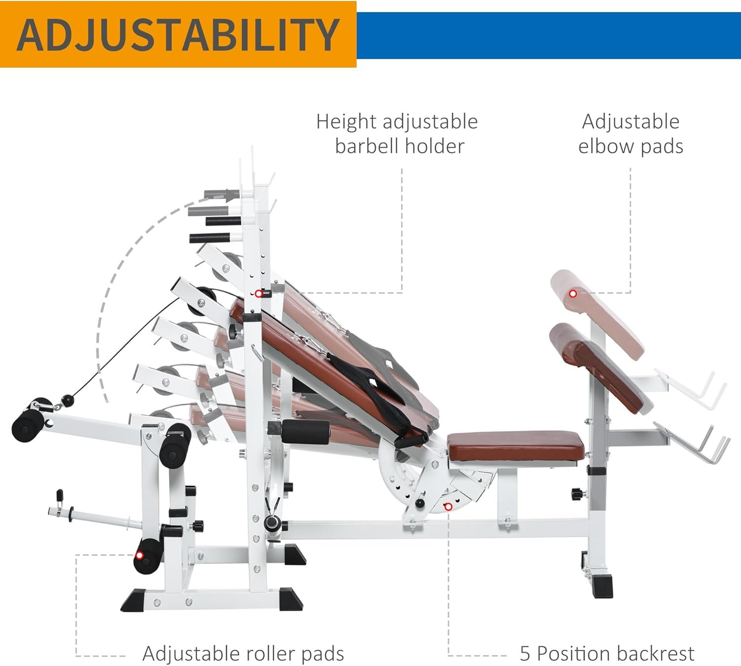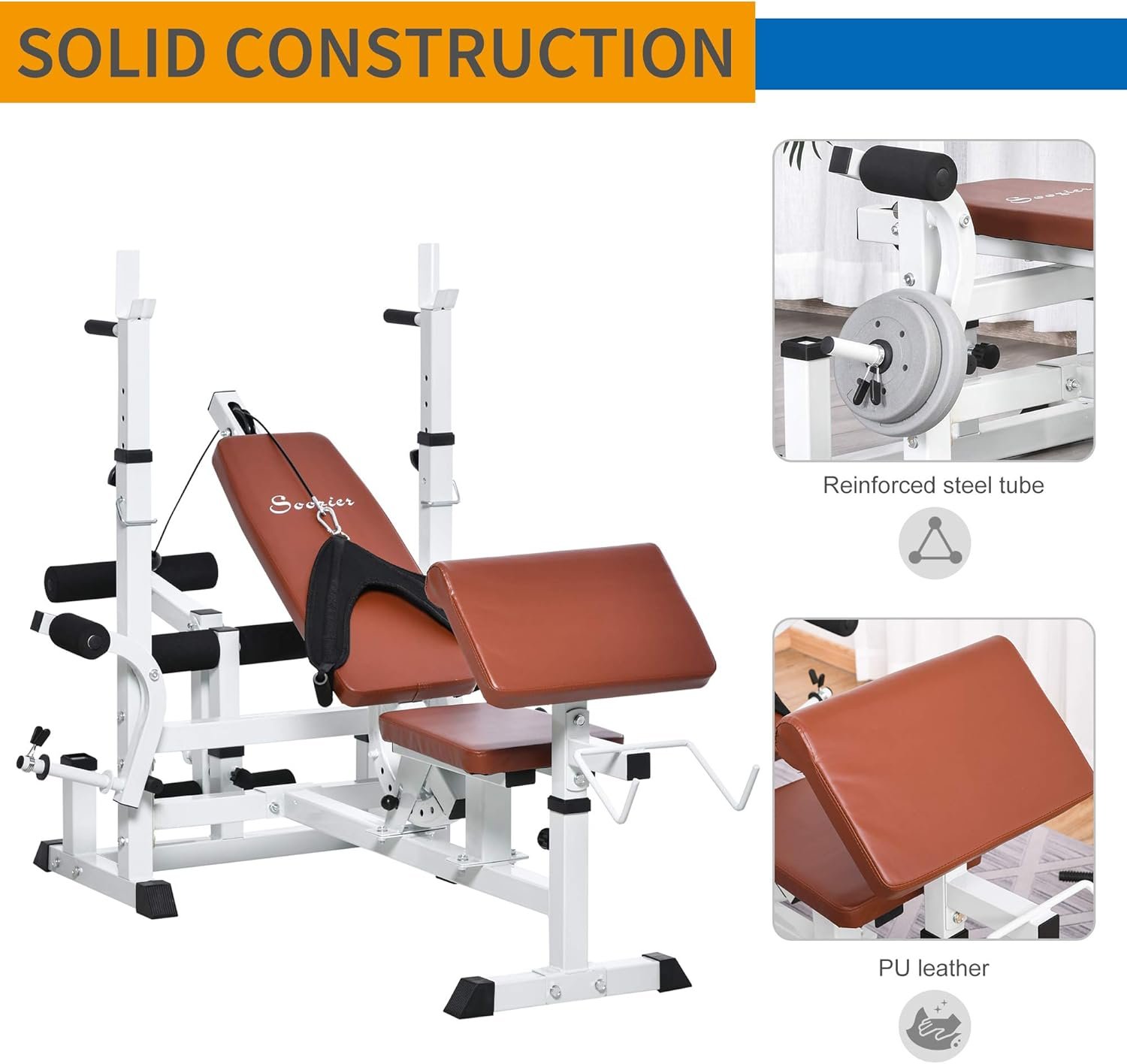 Adjustability: Our olympic weight bench is designed with a 5 position backrest, height-adjustable bar rack, elbow pads, and roller pads for an ergonomic and optimal training position. Furthermore,we finish the home gym with a soft cushion to minimize fatigue and remain comfortable while training.