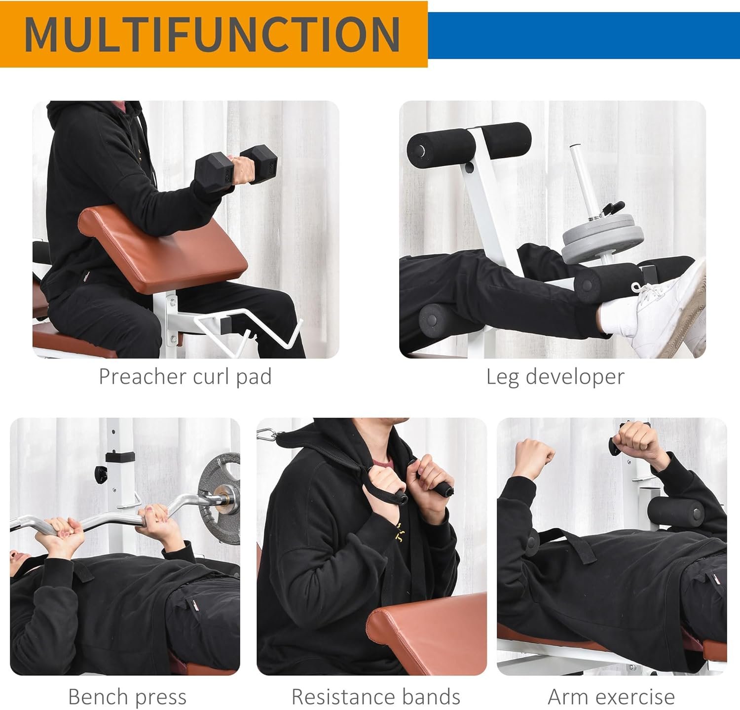 Gym at Home: The multifunctional weight bench features a preacher curl pad, leg extension machine, bench press, chest fly machine, and resistance bands. This allows you to train your legs and upper body, exercising the biceps, triceps, quads, hamstrings, & glutes anytime at home.
