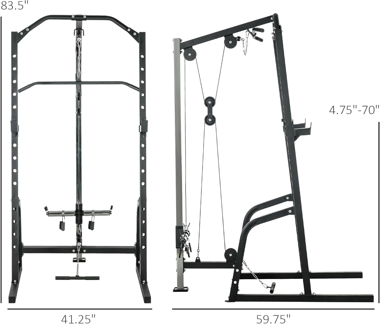 Color Black Materials Steel, PU Overall Dimensions 59.75″ L x 41.25″ W x 83.5″ H Barbell Rack Height 11″-70″ H Barbell Rack Width 41.25″ W Barbell Rack Capacity 330 lbs. Pull-up Bar Height 83.5″ H Max Counterweight 55 lbs. for a side, 110 lbs. in total