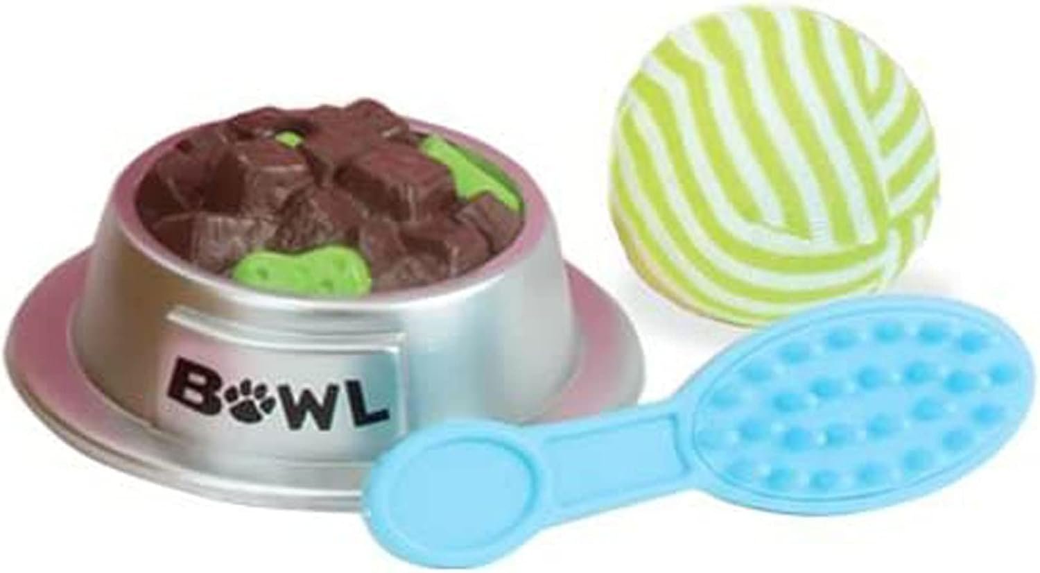 DOLL PLUSH PUPPY DOG SET: Includes a 6 1/2″ plush puppy dog, collar, leash, food bowl, brush, toy ball, toy bone, puppy bed, and blanket all packaged into a cute decorative box