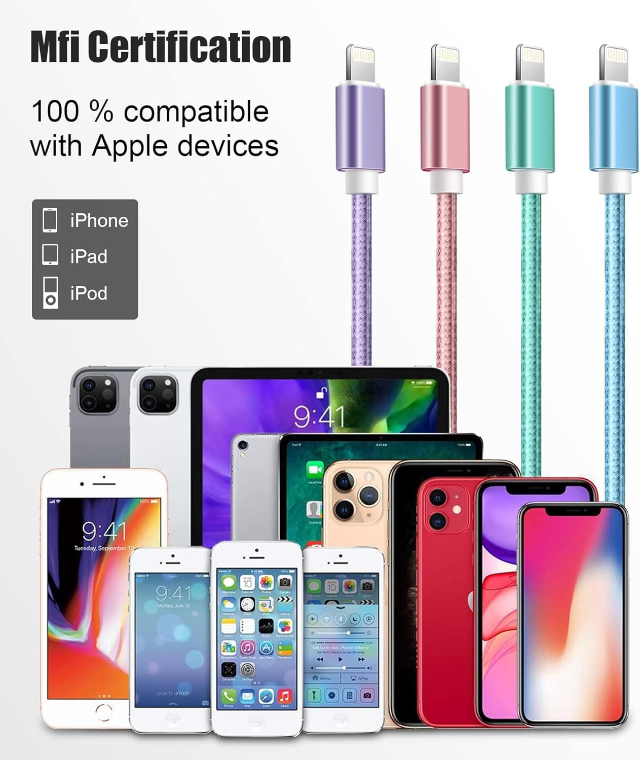 Multiple-Colors and Different Lengths: Souina 4Pack(Green,Pink,Purple,Blue) iphone charging cables are colorful, 4 Lengths (3ft/6ft/6ft/10ft) to choose, ideal to various of occasion.