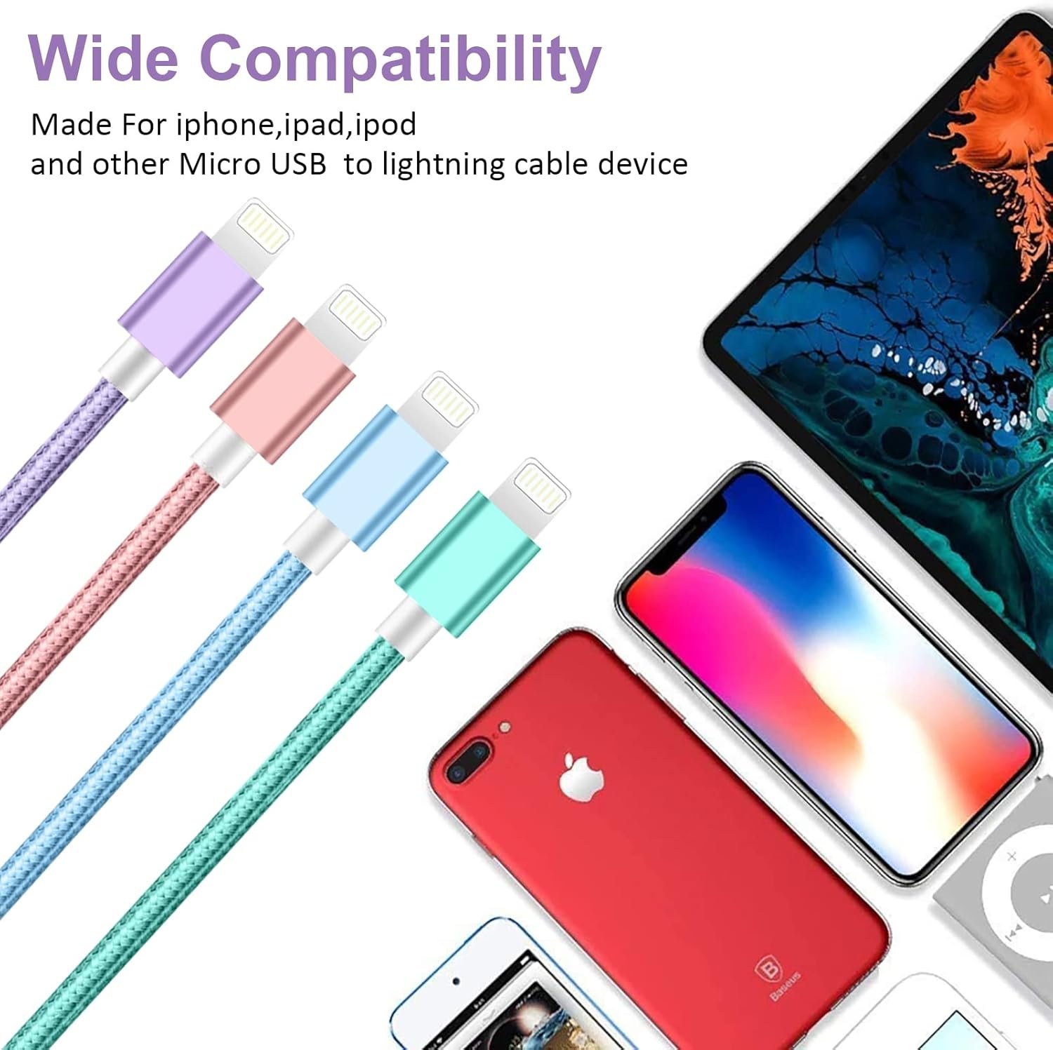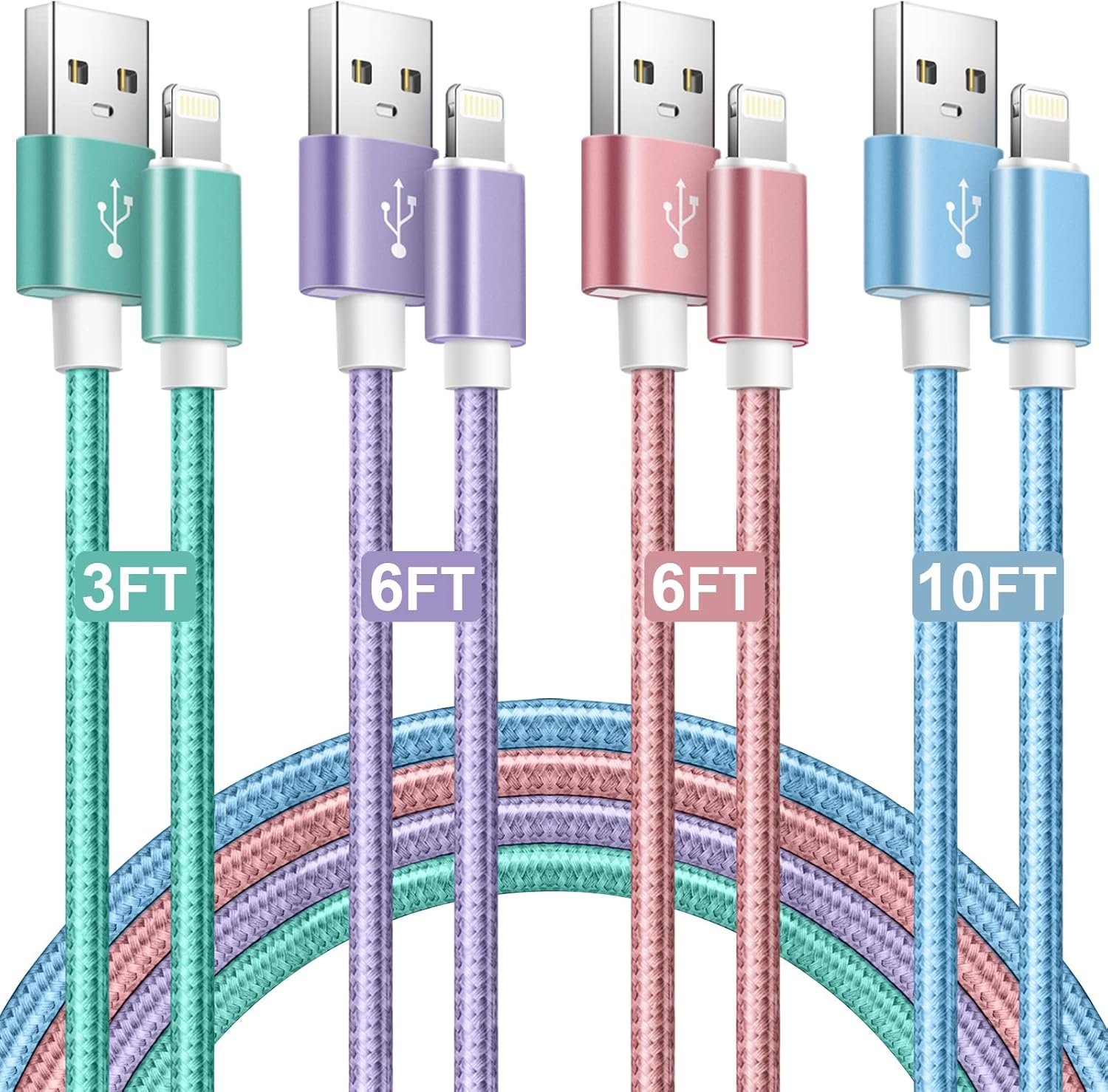 4 Pack: Green 3FT/Purple 6FT/Pink 6FT/Blue 10FT nylon braided cables.