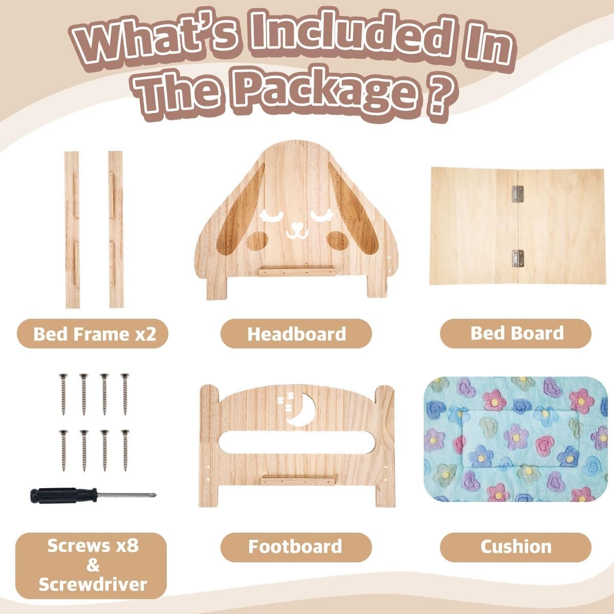 🐰 【 Patented Design 】 Unique design to make the stucture of the wooden bunny bed a more safe and secure bed with half of other’s assembly time . Instruction manual also comes in package to make assmebling the wooden bed like a piece of cake . Screw driver is also given so no worries about having to find tools to assemble it .