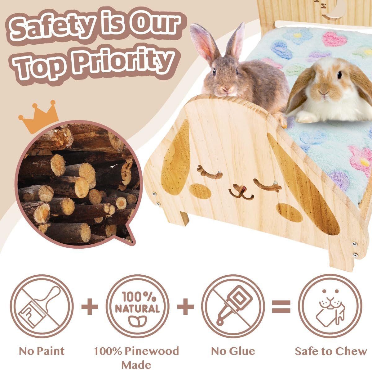 🐰 【 Vet Approved Safe Material 】 Made from 100% chewable natural premium pinewood . The wooden bed does not include harmful substanances such as glue , varnish , and paint . Bunnies can chew as much as they want without having to worry about any underlying health related problems .