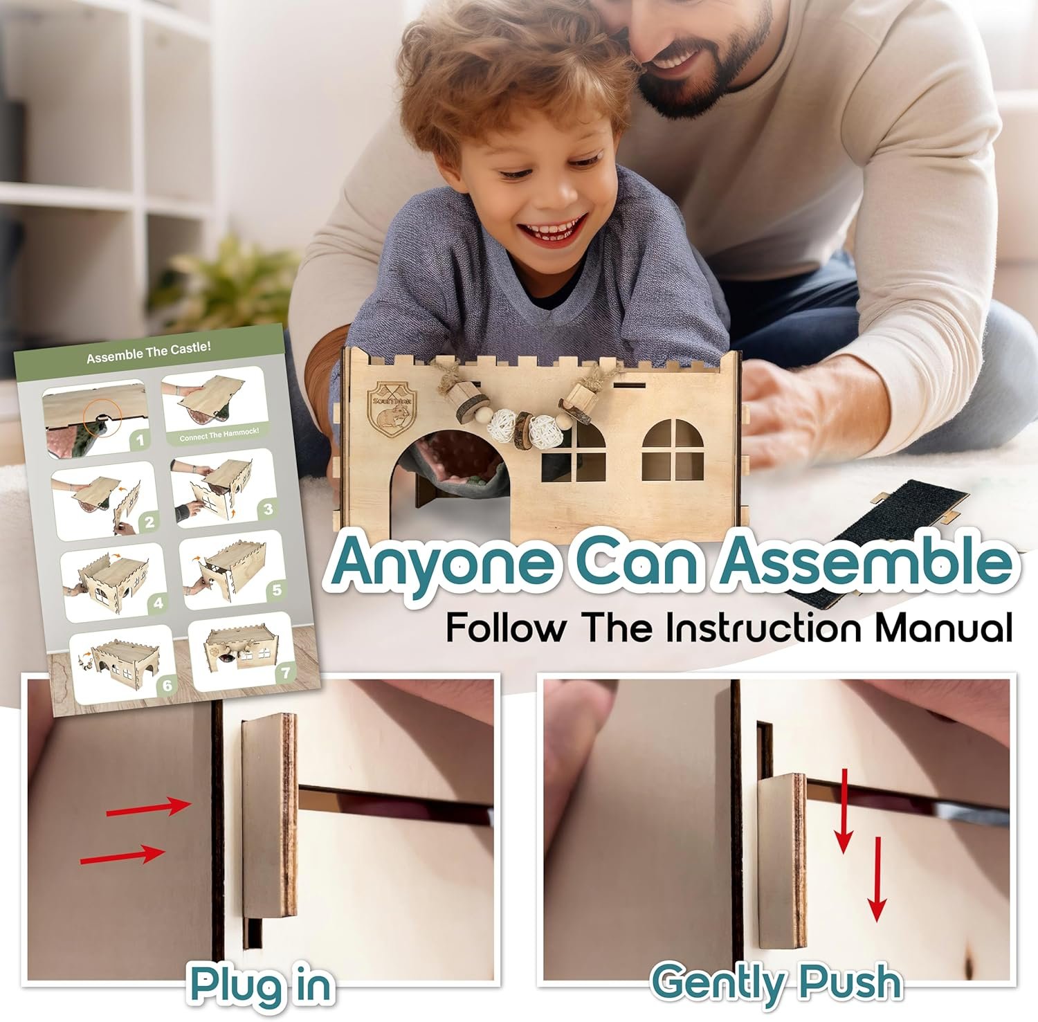 🐹 【 Easier To Assemble Than Imagined 】 Assembling the guinea pig castle has never been this easy . The intersection knobs are being changed to hooks to make assembly easy . With just a few steps you will get an end result of sturdy castle coming in with a hammock , ramp , and chew toy . Your cute little rodent can’t wait to play with it’s new toy