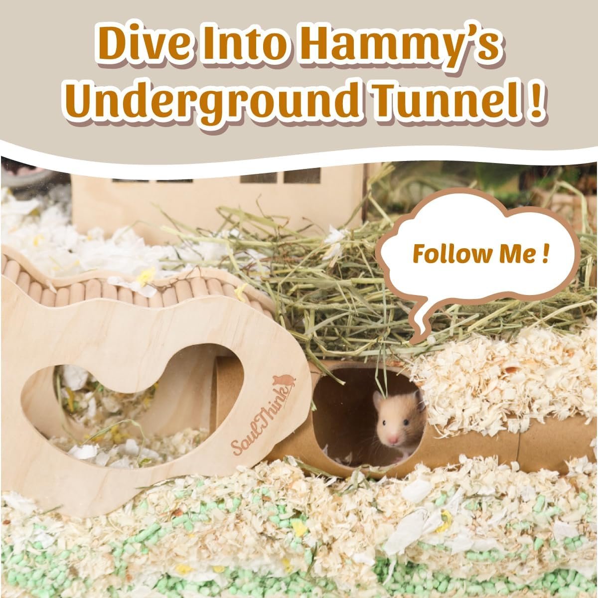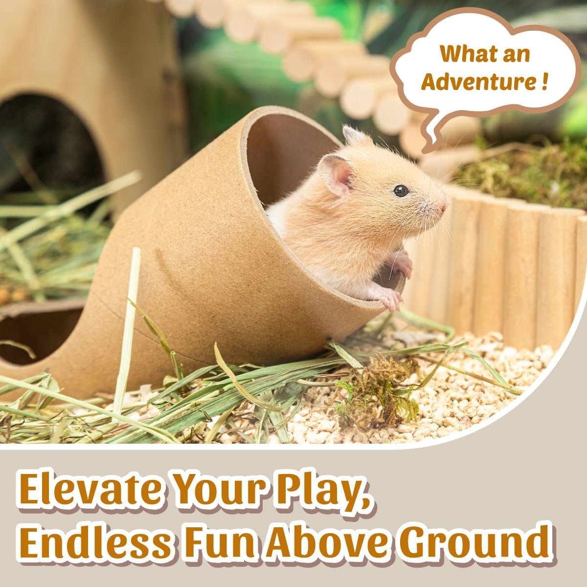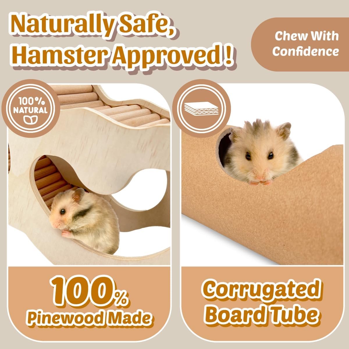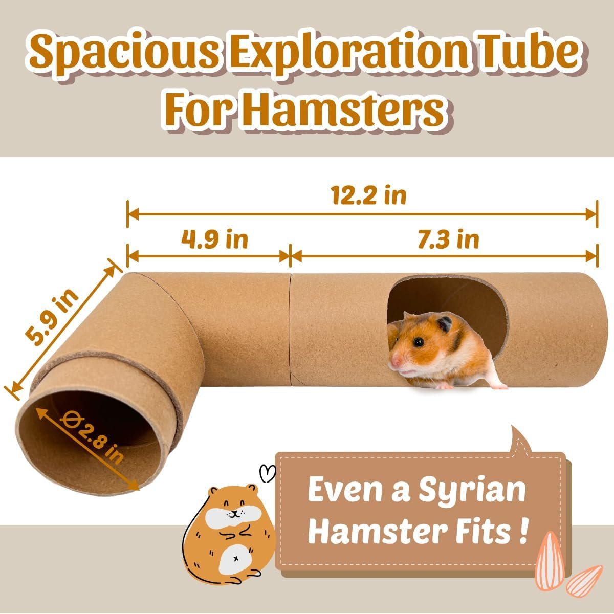 🐹 【 Vet Approved Safe Material 】 The tunnel is Made from 100% chewable natural premium pinewood coming with tubes made from corrugated board that is digestable . Both the tunnel and tube does not include harmful substances such as glue , varnish , and paint . Hamsters can chew as much as they want without having to worry about any underlying health related problems .