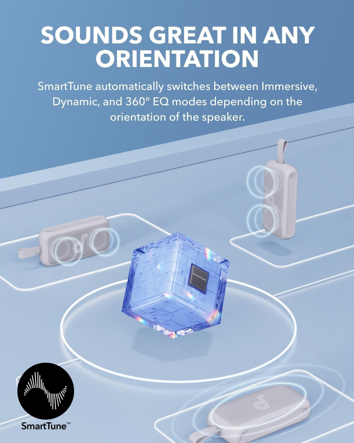 SmartTune Technology: Motion 300 portable speaker’s exclusive adaptive technology automatically adjusts to the direction and orientation of the speaker to deliver immersive sound in any scenario.