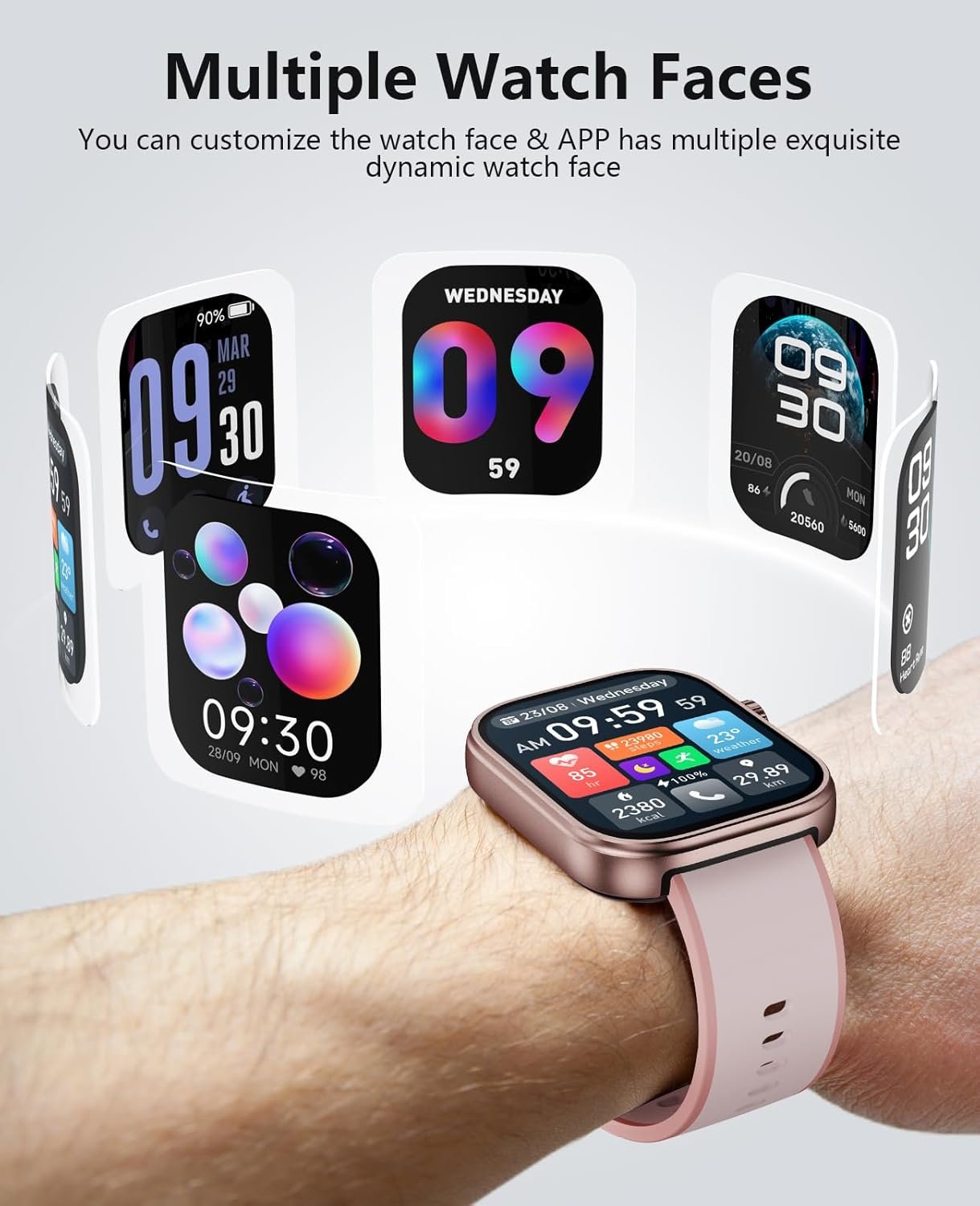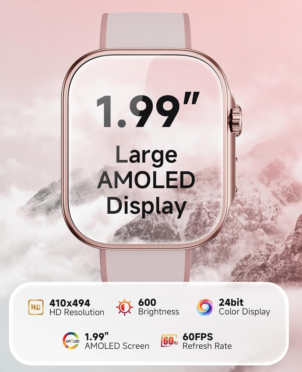 【1.99-inch AMOLED UHD Screen】The smartwatch is equipped with a 1.99-inch AMOLED screen with a resolution of 410×494 pixels, providing a delicate and clear display. 600 maximum brightness and 24bit color depth ensure clear readability in all lighting conditions. 60FPS refresh rate brings a smooth operating experience, and 322 PPI pixel density shows fine details. Supports a variety of customizable dials, allowing you to easily show your personal style.