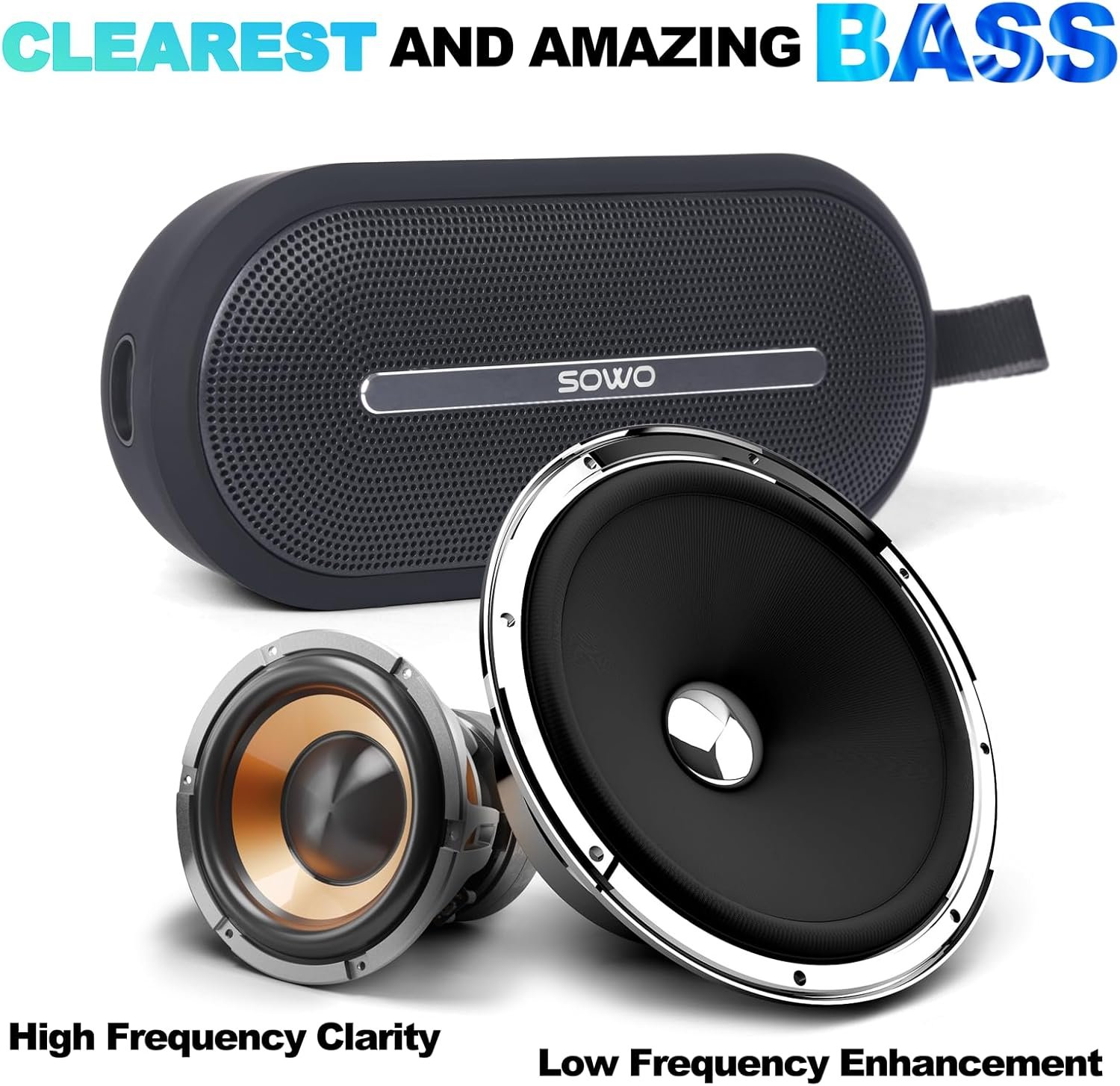 Tweeter & Bass Boost: SOWO speakers Bluetooth wireless are equipped with tweeter and woofer, bassboom technology greatly enhances treble and bass, bringing powerful music enjoyment