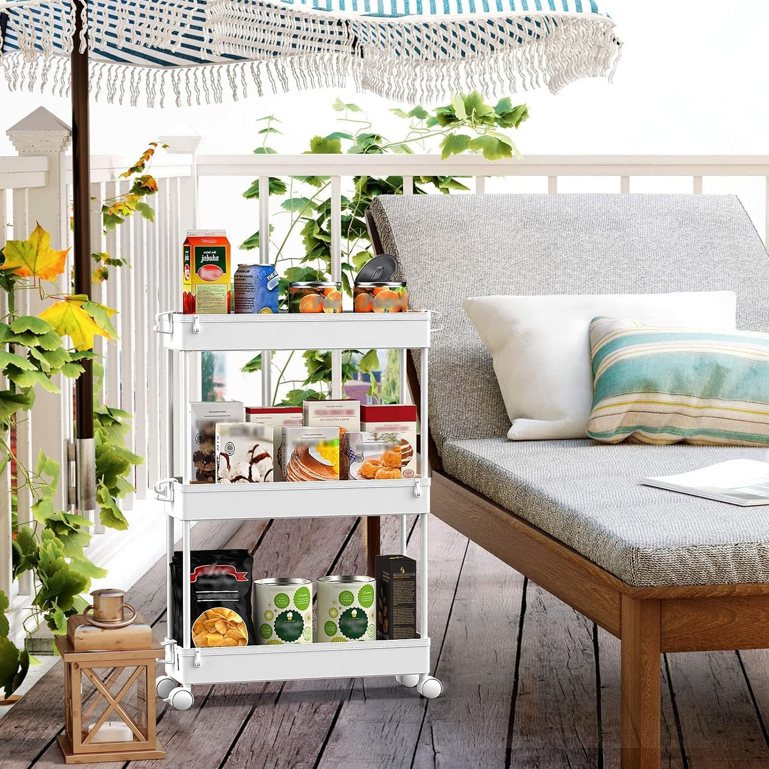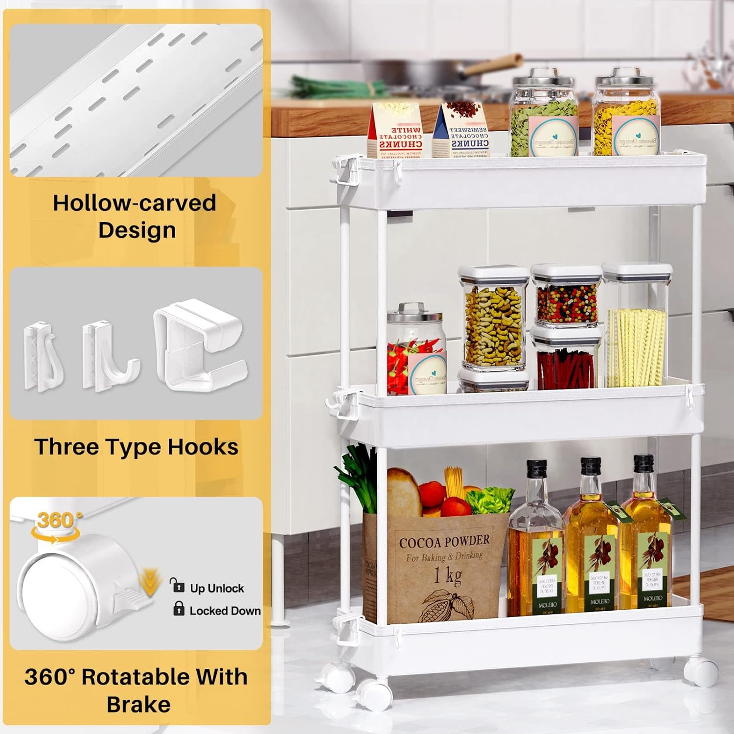 [Easy Maneuvering with Side Hoops] The storage organizer comes with 4 stable and long lasting wheels with the help of which moving the cart from one place to another becomes easy in limited spaces. It also has 3 side hoops to give you more storage space.