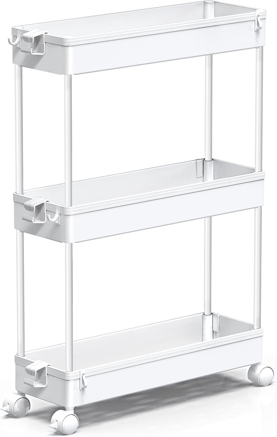 [Adjustable 3 Layer Storage Cart] This rolling storage cart comes with 4.75 inches slim construction with 3 tier for it to easily fit in narrow spaces in your home. Ideal for bathrooms, kitchen, garage, closet, laundry rooms, offices or in-between your washer and dryer.