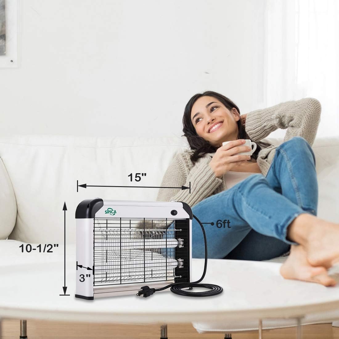 SPICA Insect killer Application: Any indoor use, covers up to 6,000 square feet, including living room, dining room, kitchen, bedroom, office, supermarket, washing room, garage, storage cellar, restaurant, hospital etc. Also it can be used for outdoor area as well, just keep the device away from water or rain