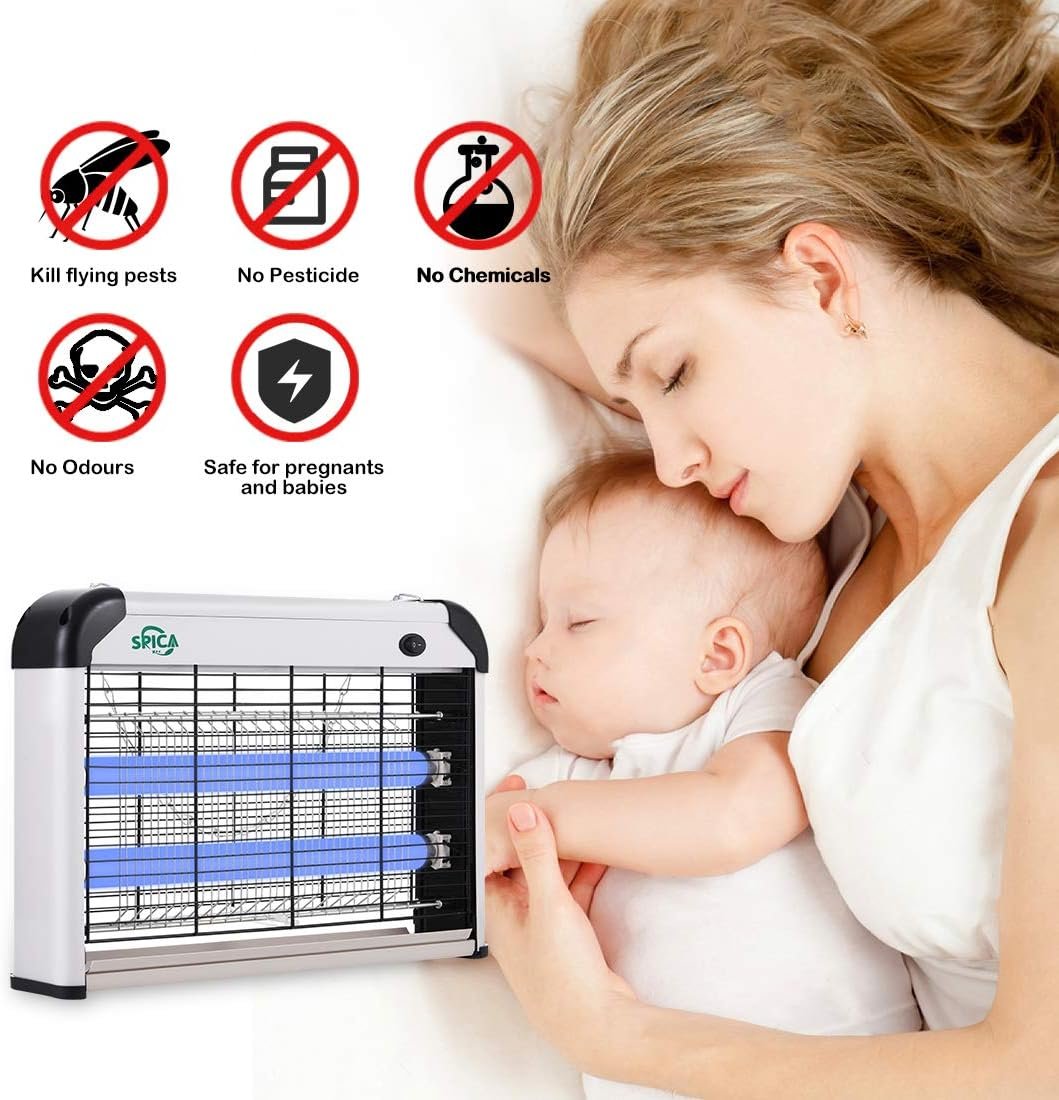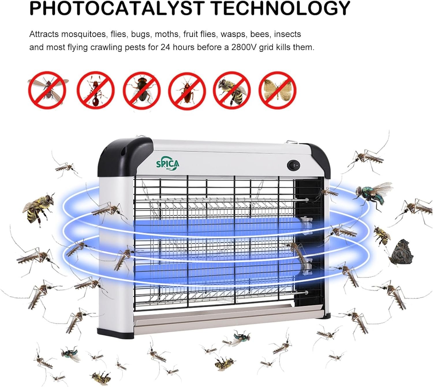 SPICA Pest Killer Design: Double face designed for 360 degree attracting and killing mosquitoes flies etc. Flame resistant material housing can prevent fire accident. Protective grids prevent kids or pets touching inside. The pure aluminum frame is easy for cleaning, antioxidant, sturdy, lightweight. The insect killer device has a hang metal chain, it can stand on any flat surface or hang-up. Detachable catching tray for easy clean-up