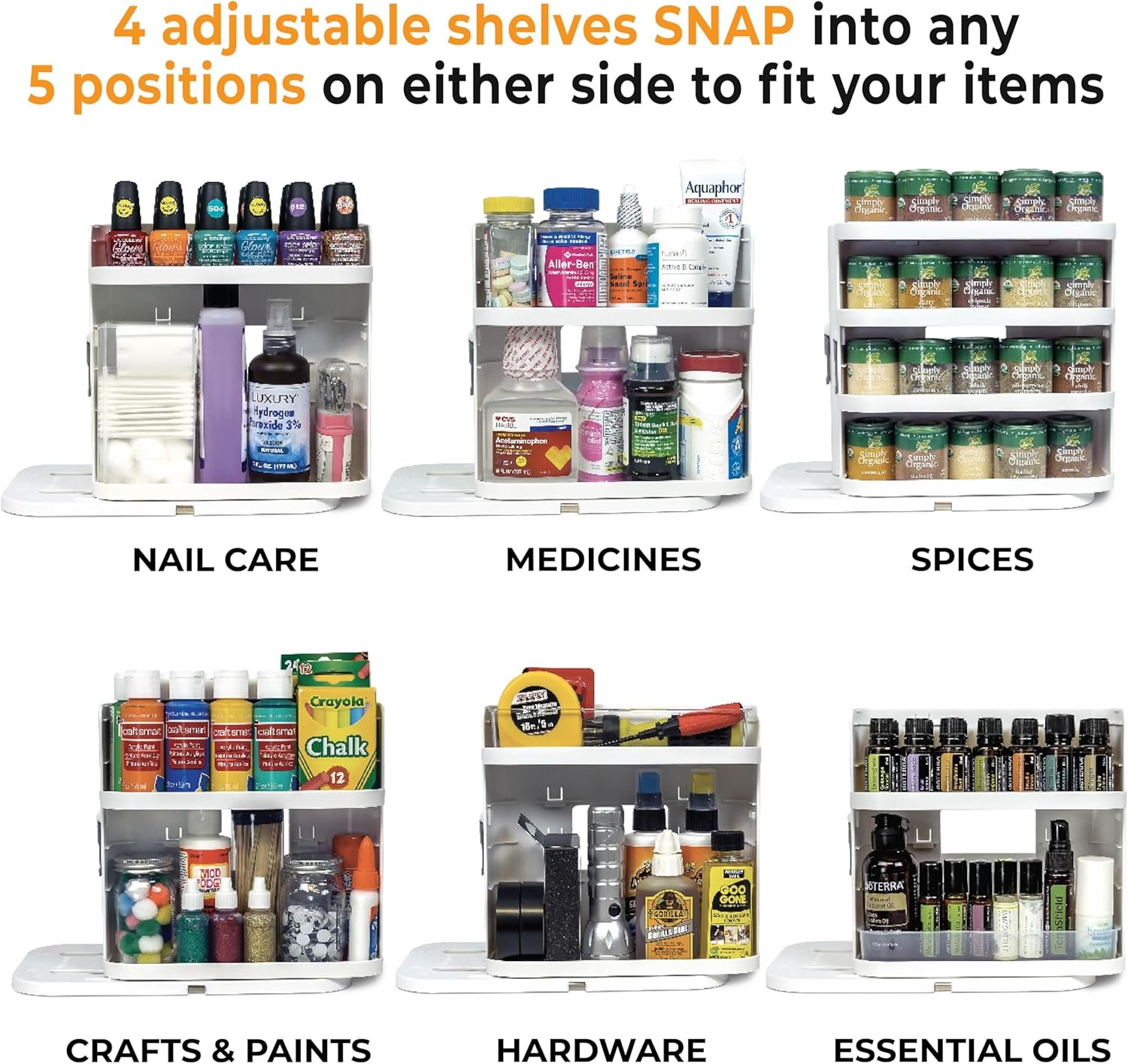 Adjustable Shelves for Customized Storage: Easily snap in shelves to accommodate the height of your spice jars or seasoning containers. With 5 adjustable locations on each pull-and-rotate pod, you can arrange your spices exactly as you need them. Each shelf measures 8.5″ in width and 2.75″ in depth.
