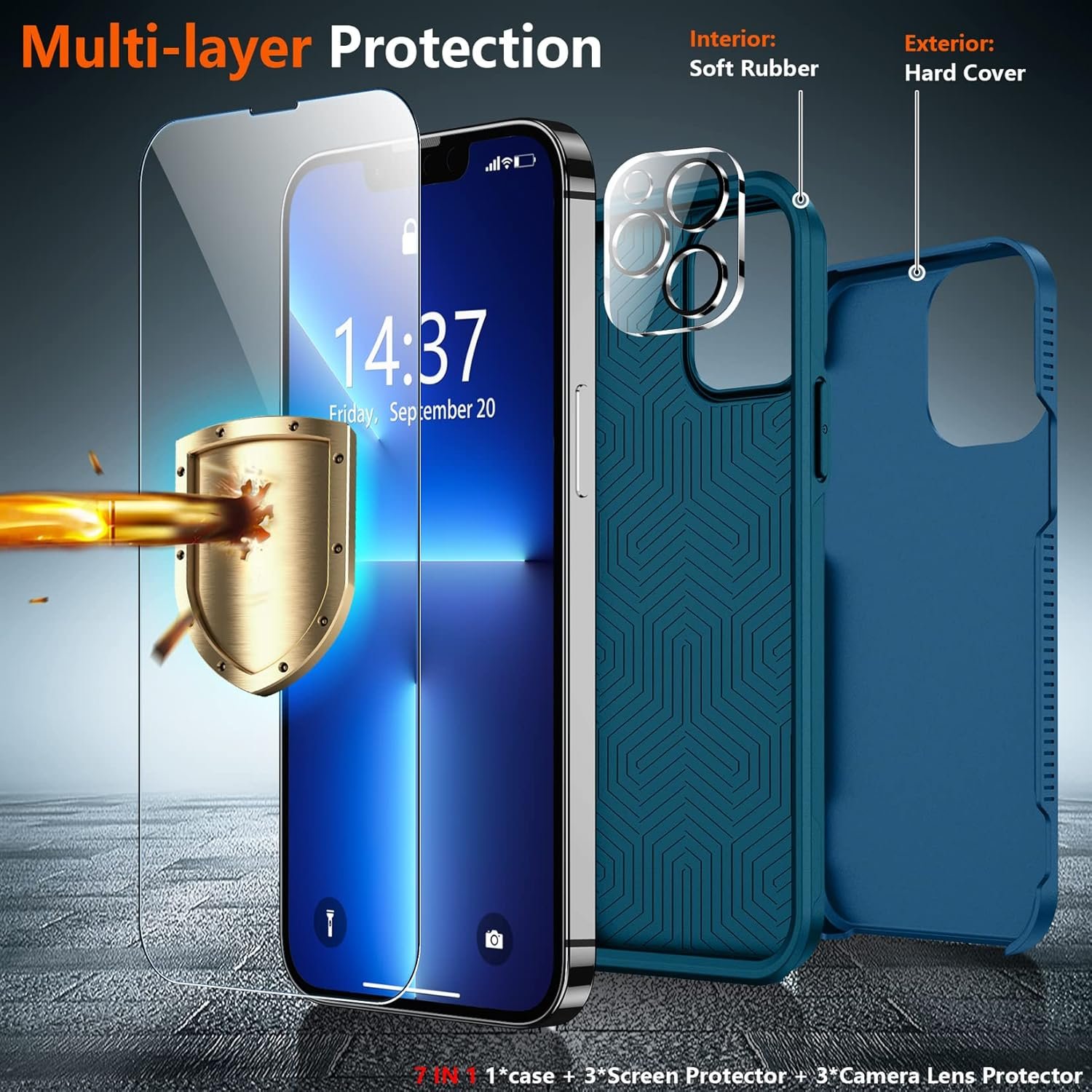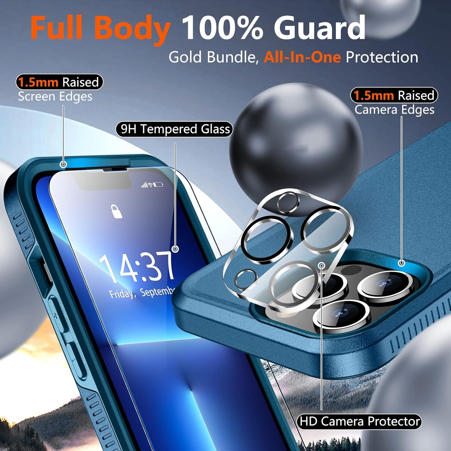 【Full Protection】Passed Military Drop Tested up to 10 FT. 2-Layer structure provides 360°full body rugged protection. The iPhone 13 pro max case is made with flexible rubber inner cover and hard polycarbonate back cover, provides good shockproof and anti-drop damage protection. Plus 2 pcs tempered glass screen protector with high touch sensitivity prevent scratches and crack. 2 pcs HD camera lens protector provide full protection without affecting photo and video quality.